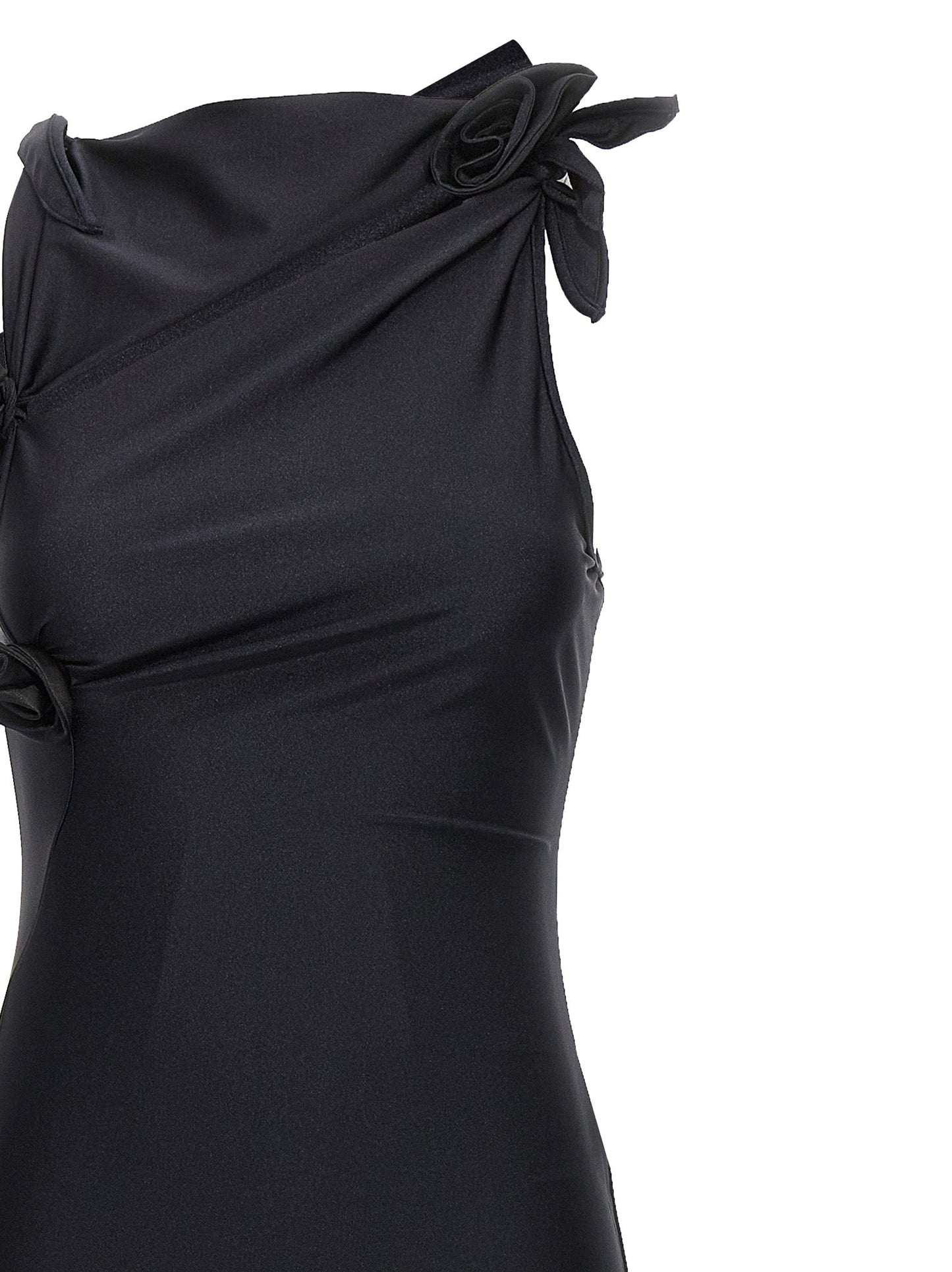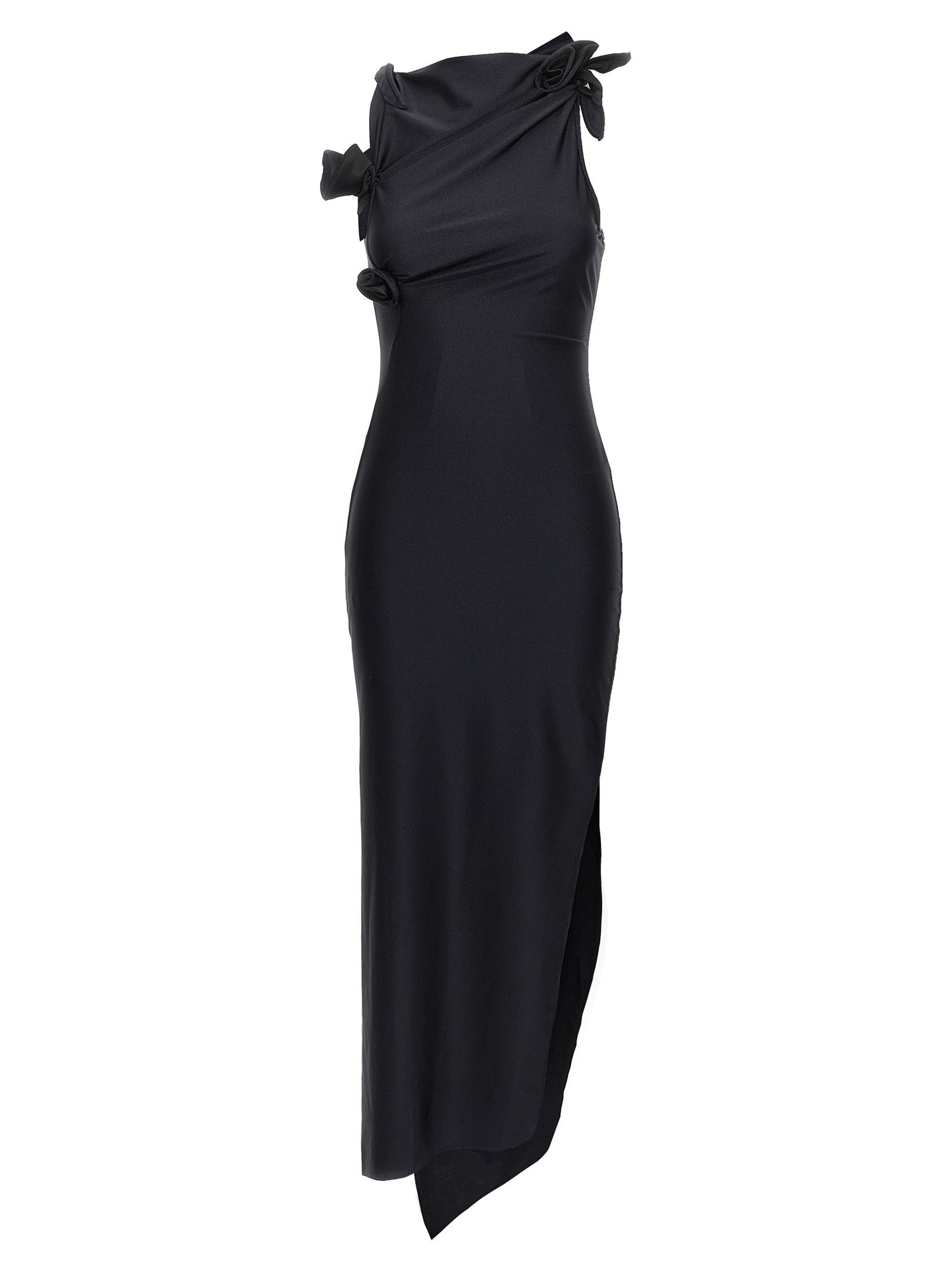 ストレッチファブリックの非対称の花の長い洗練されたドレスは、バラの詳細を切り取ります。 コペルニ 「非対称の花」長いドレス サイズにぴったりです