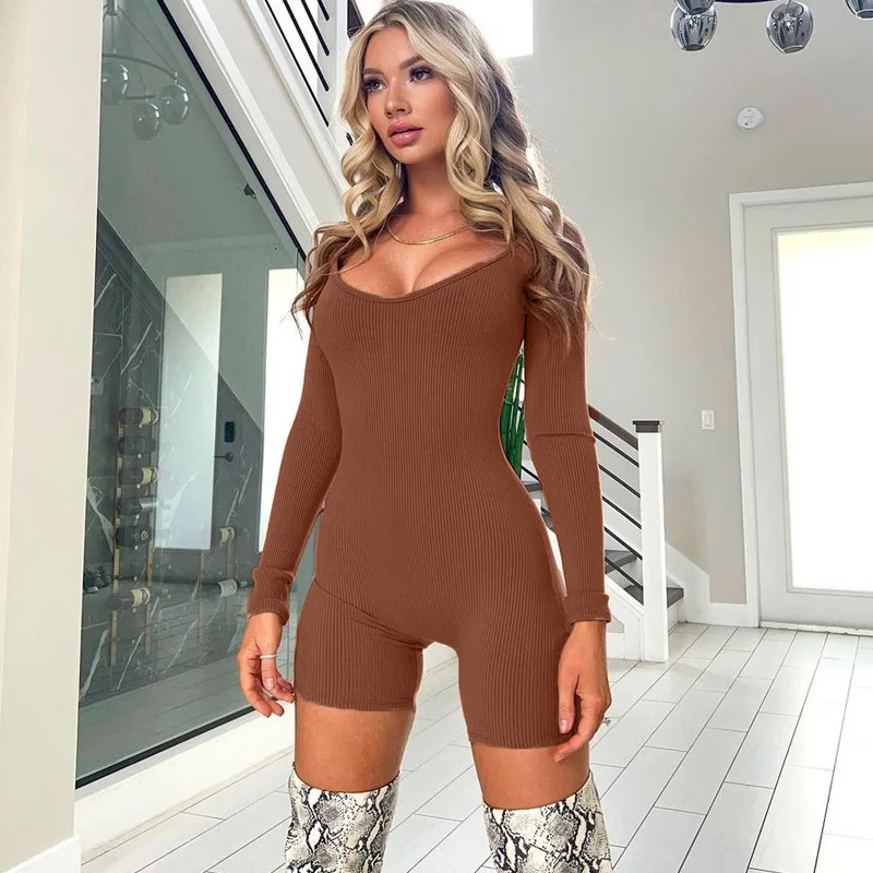 Hugcitar Women Solid Ribbed Long Sleeve Playsuit Skinny Bodycon Sexy Sportswear Fitness Streetwear Rompers Outfits Wholesale