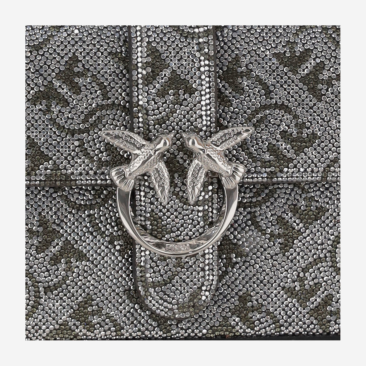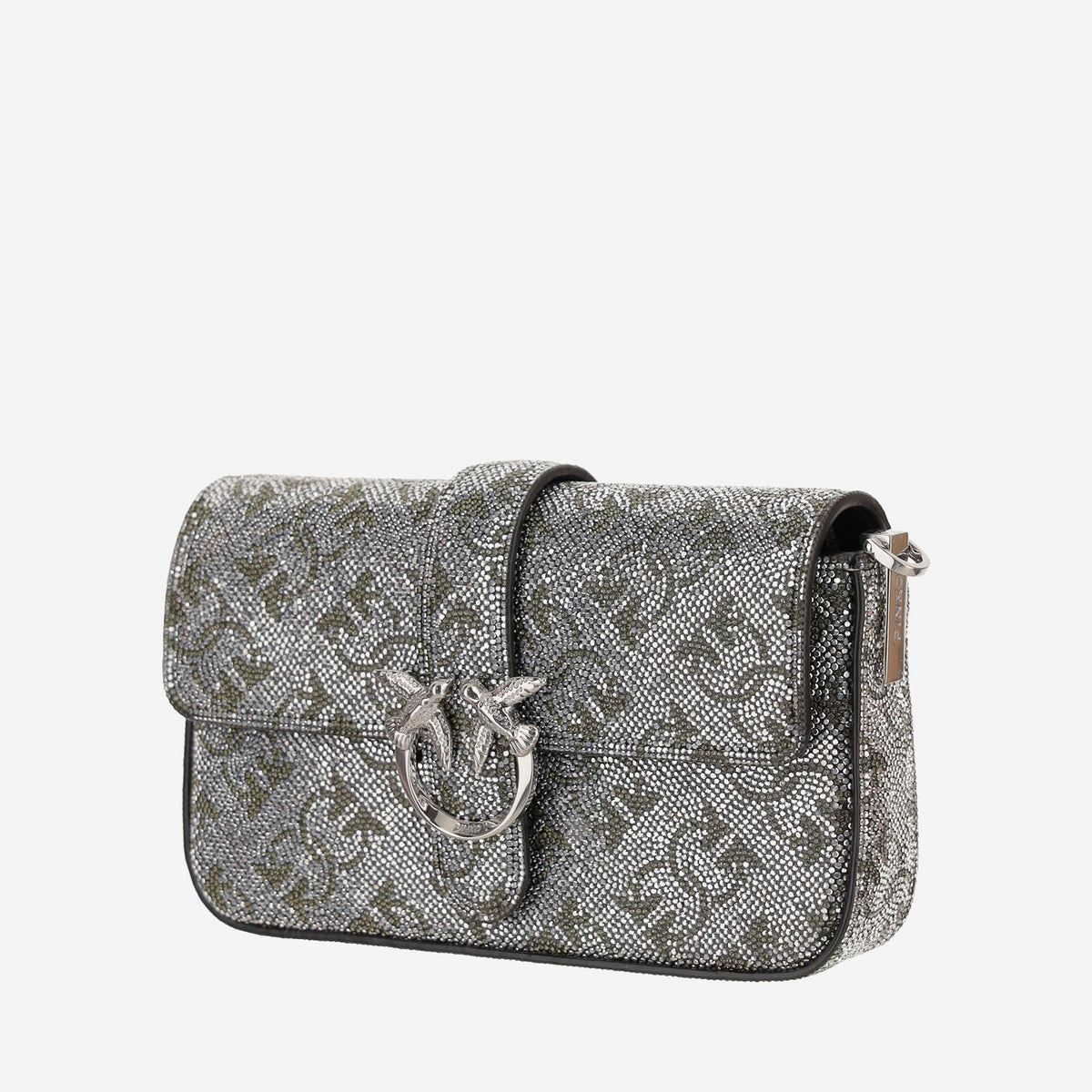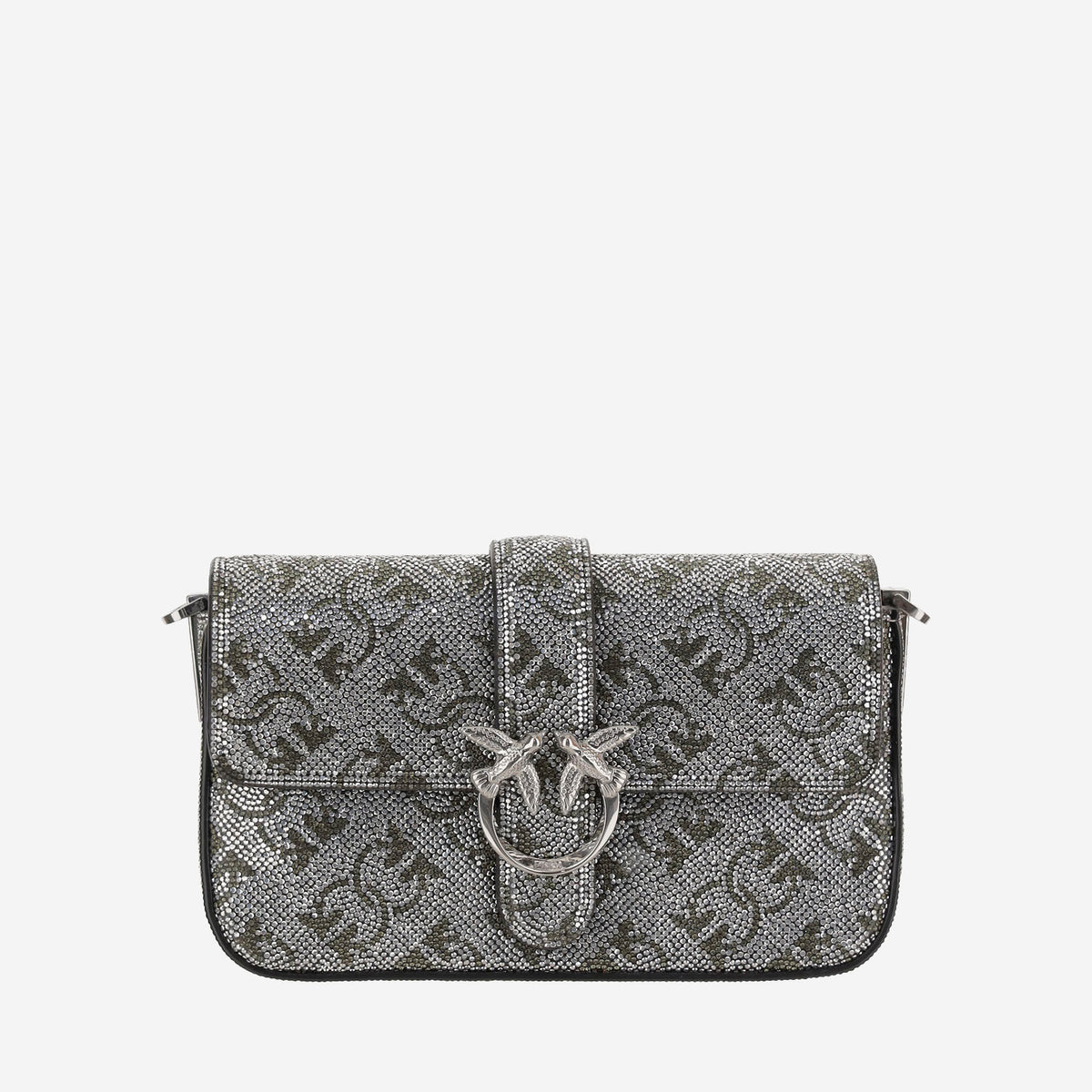 • 二酸化シリコンと革で作られたバッグ • フラップの磁気閉鎖 • ラブバードダイヤモンドカットバックルは正面にあります • ラインストーンを備えた全面的なモノグラムモチーフ • 取り外し可能なチェーンと革のショルダーストラップ • 銀 • 中国製 • 組成:100%二酸化シリコン、100%革 • 高さ:11 Cm • 幅:4 Cm • 長さ:18 Cm