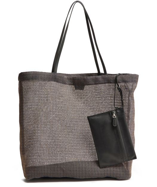 説明 : Shopper / tote bag, double handles, thin strap, detachable interior purse, visible topstitching.