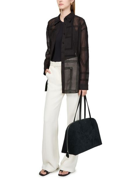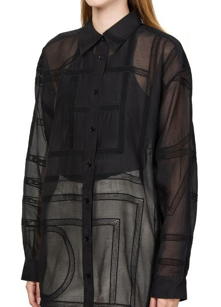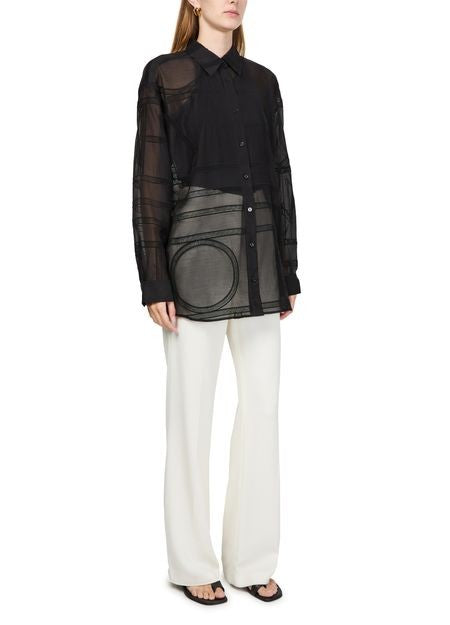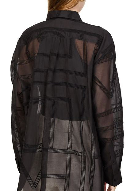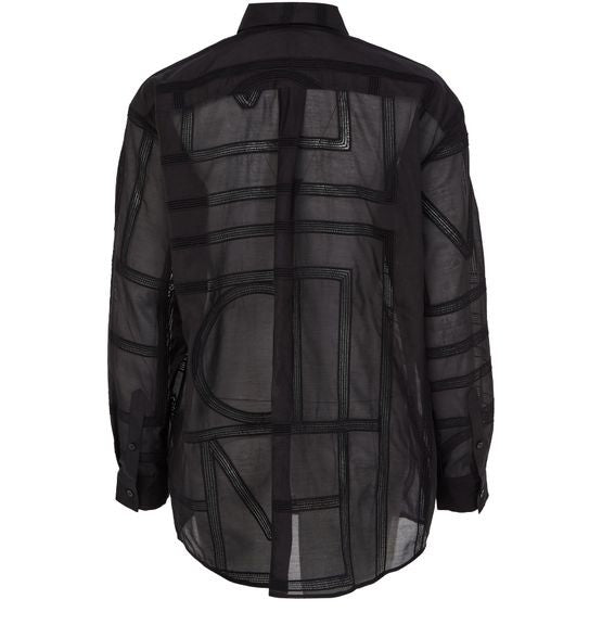 説明 : Loose fit, long-sleeved, long, cuffed sleeves, front buttoned closure, sheer lining, visible stitching, buttoned-down collar.