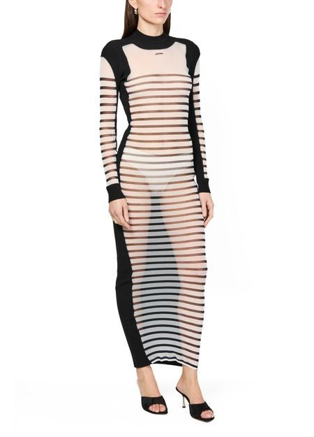 説明 : コンシールバックファスナー, 目に見えるステッチ, マキシドレス, モックネック, ロングスリーブ, ニットドレス, カフス, ボーダー柄, カフスボタン付きスリーブ, フィットウエスト.