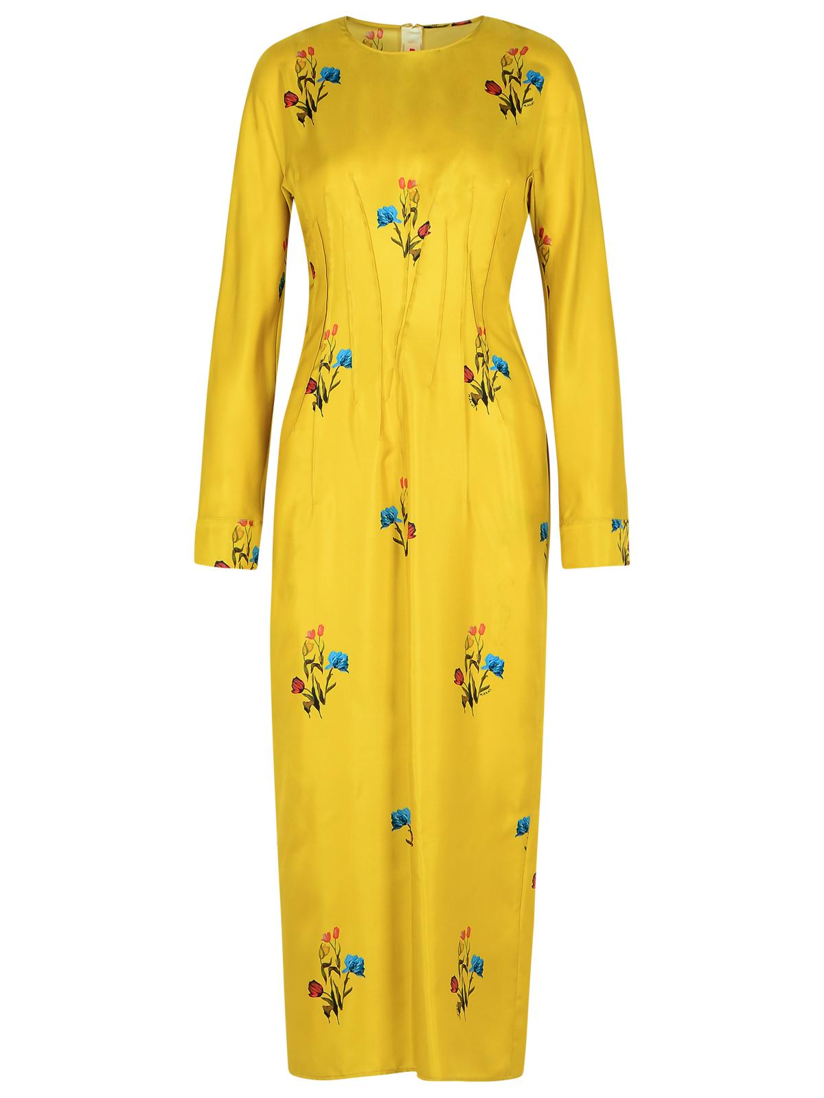 • 丸いネックライン、花の印刷パターン、腰の構造的ステッチ、背中の見えないジップクロージャー、フックとボタン、仕上げカフ、バックスリットヘム • マルニ • マスタードシルクドレス
