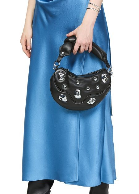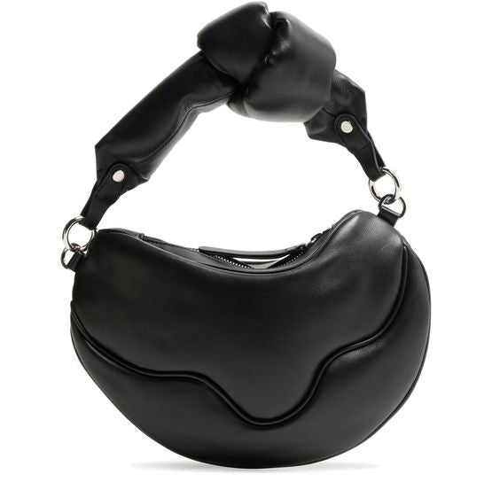 説明 : ファスナー開閉, 飾りステッチ, 刻印ロゴ, シルバーフィニッシュ, シングルコンパートメント, 手持ち, バゲットバッグ, ワイドストラップ, シングルハンドル.