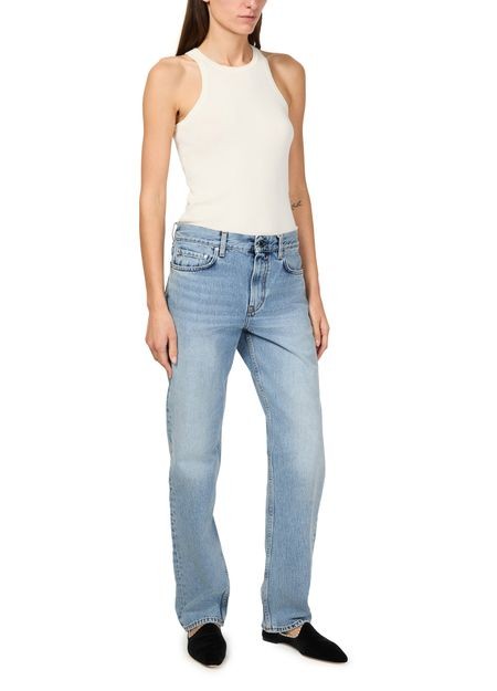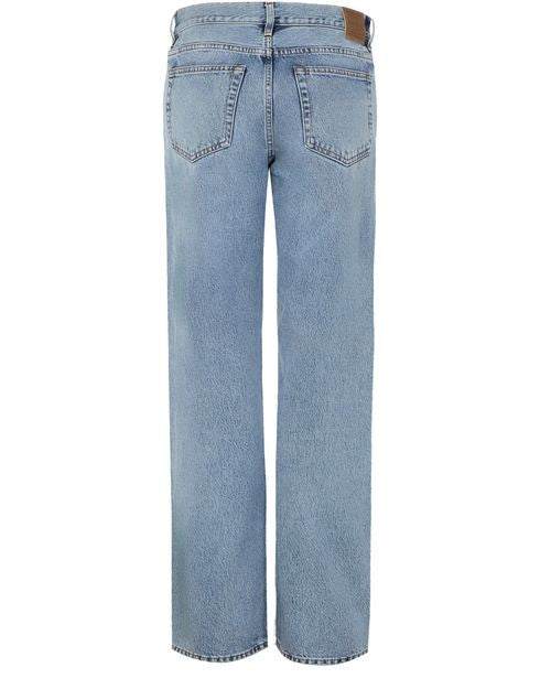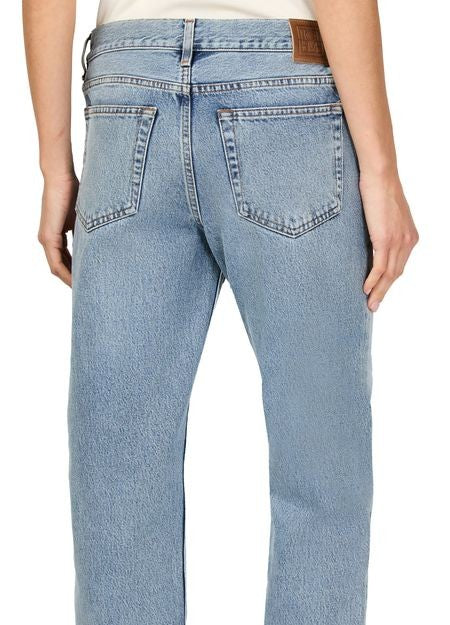 説明 : Faded denim, buttoned zipper closure, belt loops, straight cut, back leather logo, front and back pockets, five-pocket style, visible stitching.