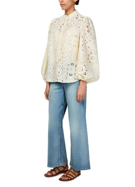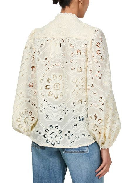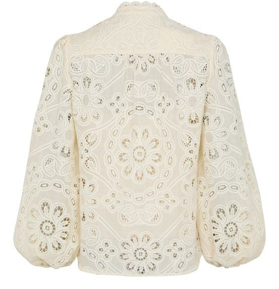 説明 : loose fit, high-neck, long-sleeved, puff, floral embroidery, button fastening, scalloped edges, lace details.