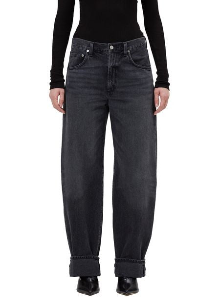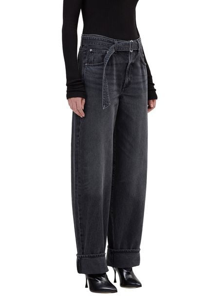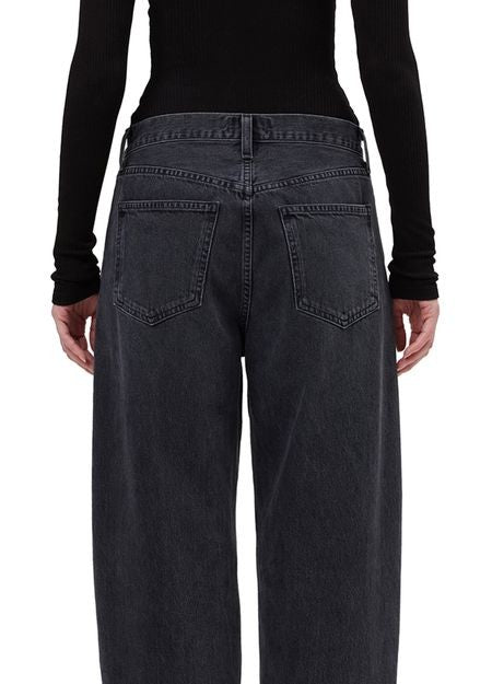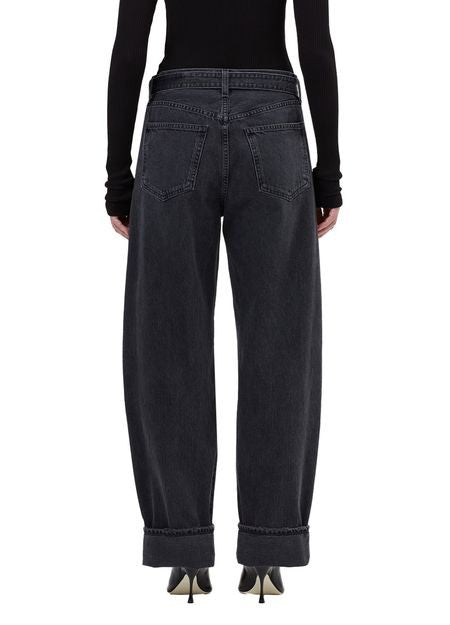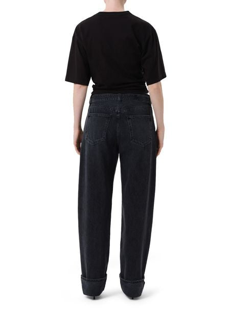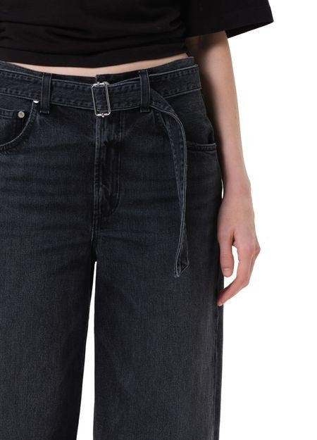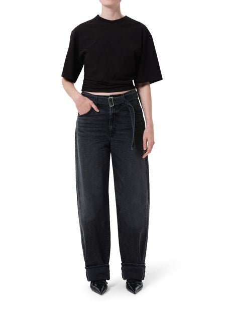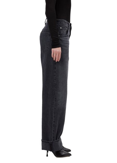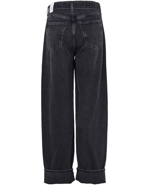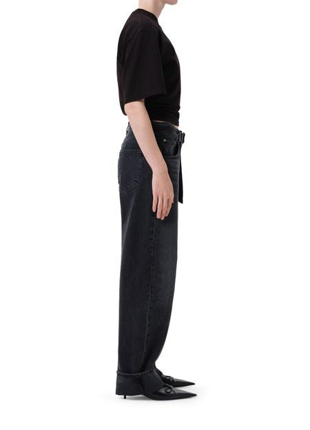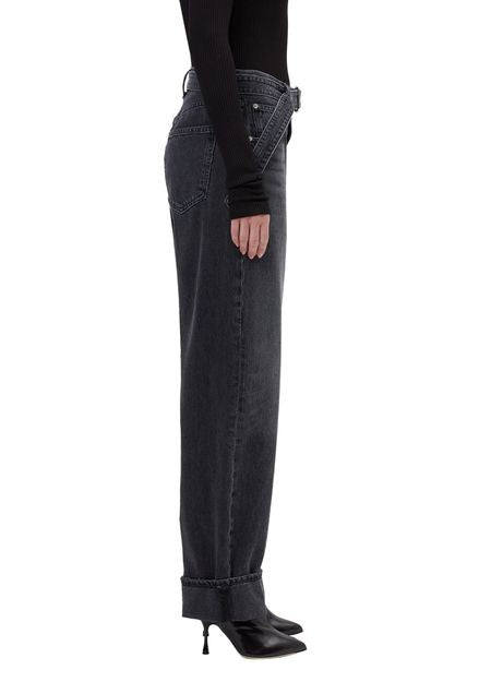 説明 : Wide cut, faded denim, high-waisted fit, back pocket, visible stitching, buttoned zipper closure, belt loops.