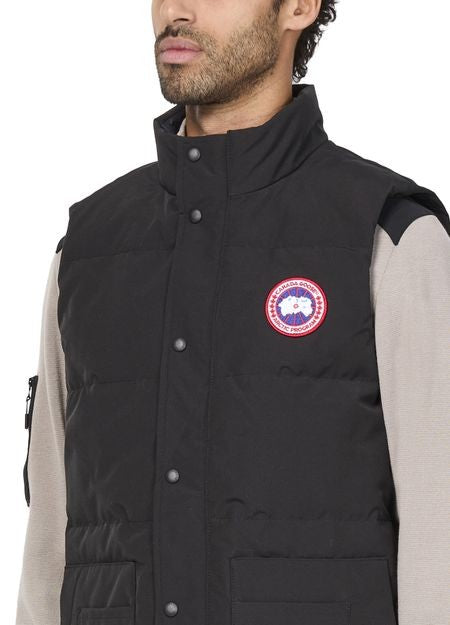 説明 : ボタン&コンシールファスナー開閉, 胸元ロゴ, ショート, 前面ラージポケット, ノースリーブ, ハイネック, パフジャケット.