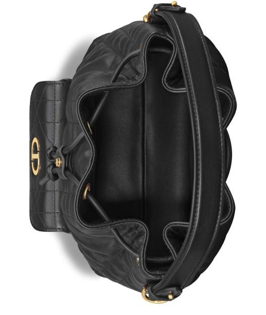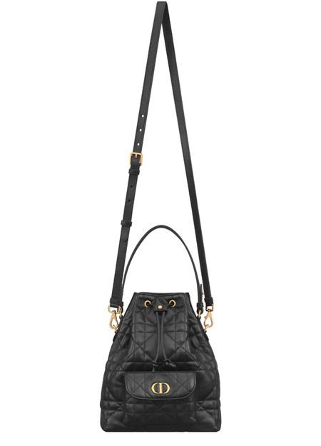 説明 : CD signature on the front, drawstring closure, slip pocket on the front with magnetic flap, interior slip pocket, removable leather top handle, adjustable and removable leather shoulder strap.