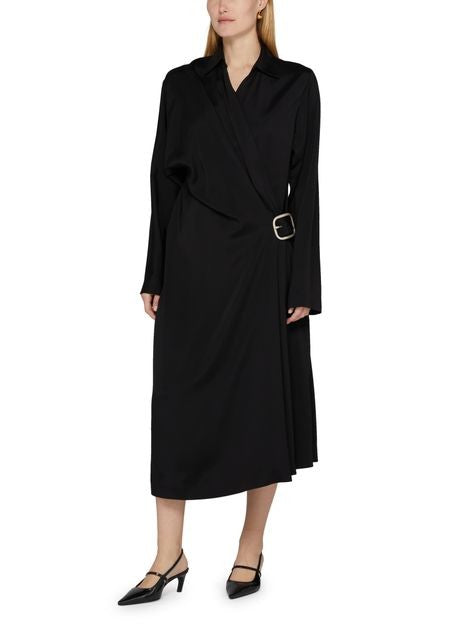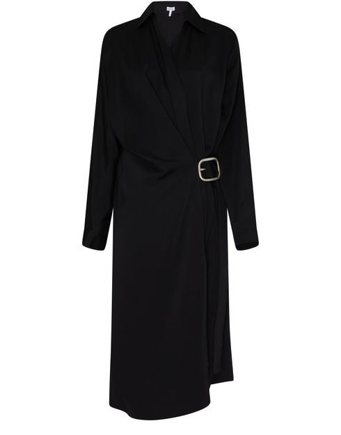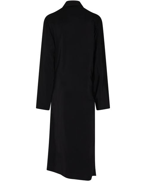 説明 : ラップアラウンド, ドレープディテール, 目に見えるステッチ, シャツカラー, ミディドレス, アップリケロゴ, ロングスリーブ, ラップドレス, ボタン付きカフス, カフスボタン付きスリーブ.