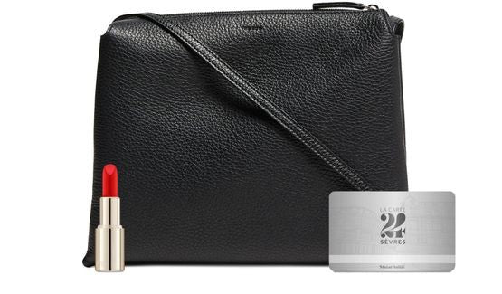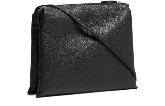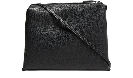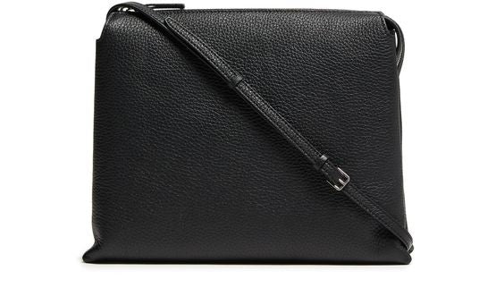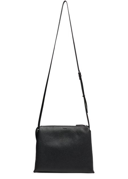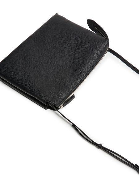 説明 : Crossbody bag, clutch, thin strap, adjustable strap, front logo, grained leather, zipper closure, visible topstitching.