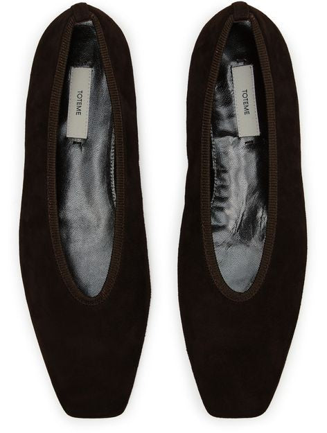 説明 : Ballet pumps, suede, flat heel, low heel, closed, square toe, logo-printed insole, pull-on design, visible stitching.