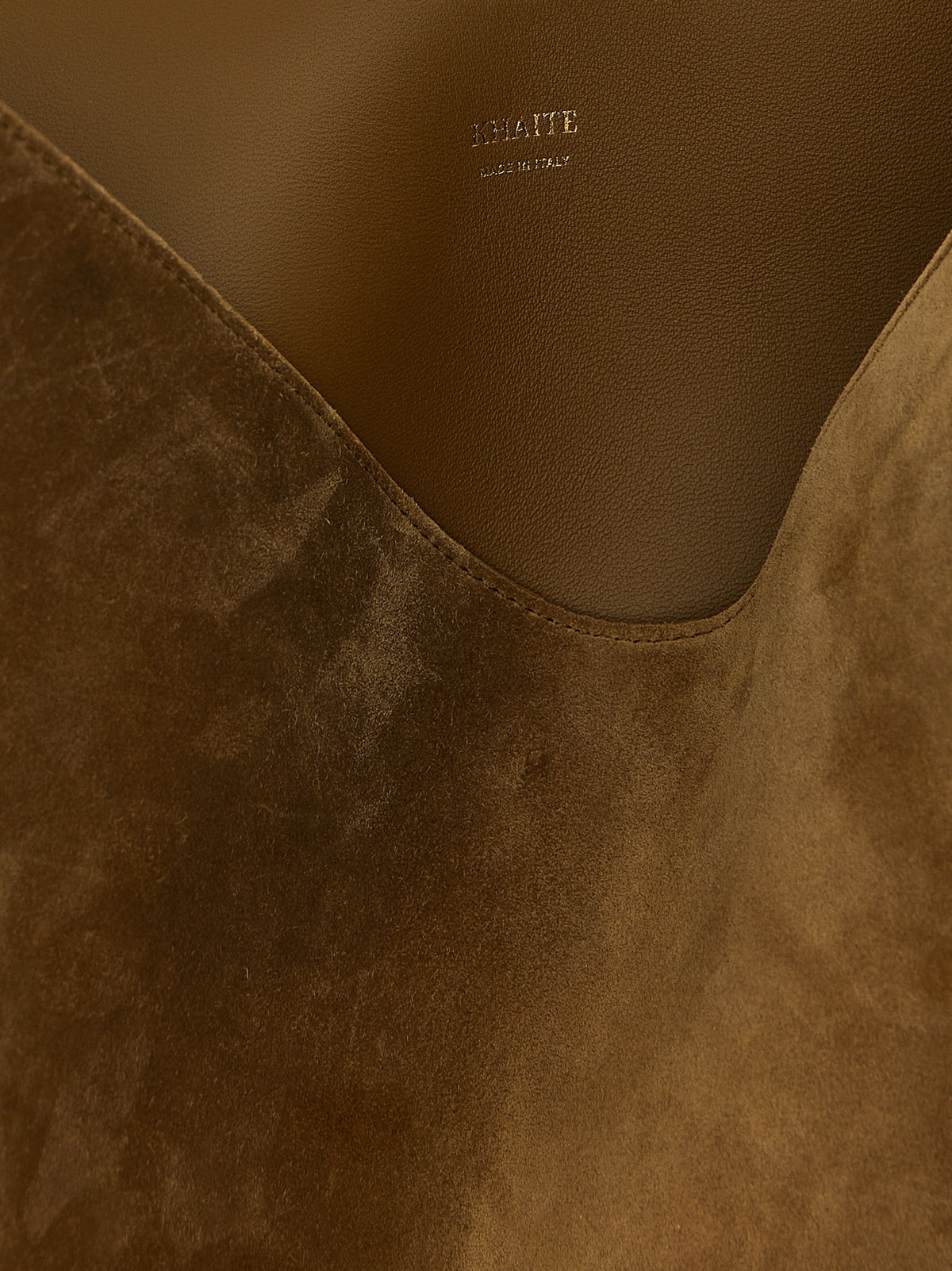 • 固定ハンドル、ゴールドメタルフラップの閉鎖、フロントエンボスロゴを備えたロータススモールスエードショッピングバッグ。 • カイト • 「ロータススモール」ショッピングバッグ • W 45.72 X H 35.56 X D 21.59 Cm