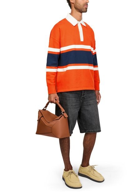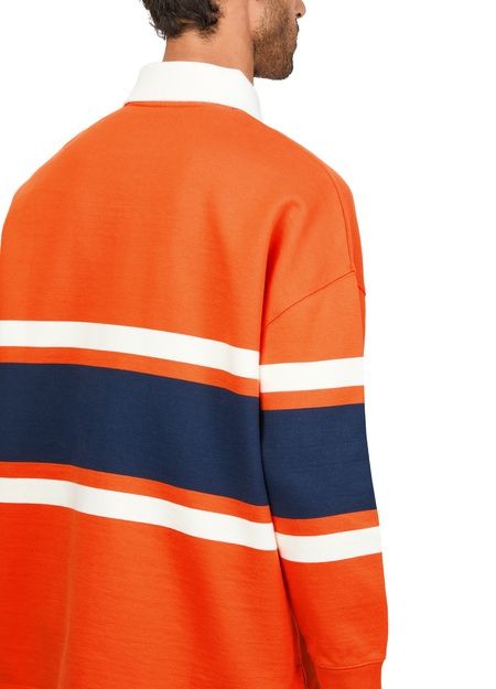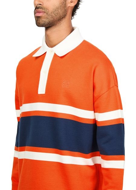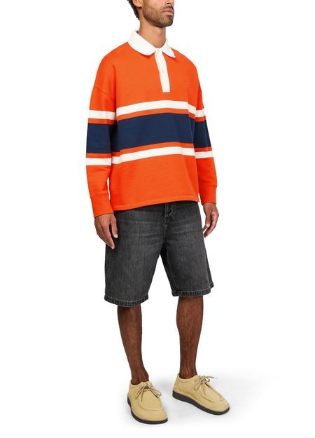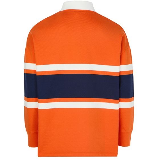 説明 : Loose fit, embroidered chest logo, striped print, polo-shirt collar, cuffed sleeves, long-sleeved, button fastening.