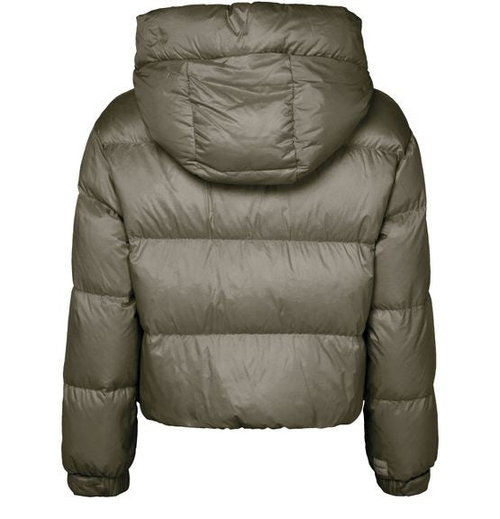 説明 : Short, hood, long-sleeved, patch pockets, zipper closure, padded texture.