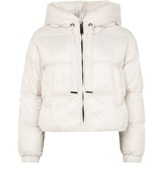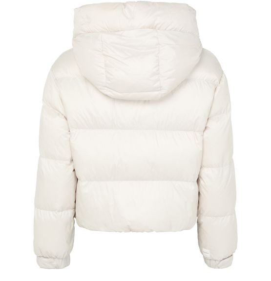 説明 : Short, hood, long-sleeved, patch pockets, zipper closure, padded texture.