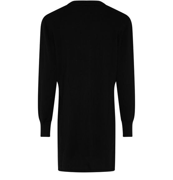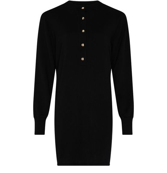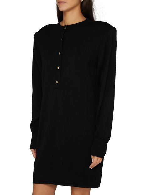 説明 : フロントボタン留め, ゴールド仕上げ, アップリケロゴ, 目に見えるステッチ, ミニドレス, ロングスリーブ, クルーネック, ニットドレス, カフス, カフスボタン付きスリーブ.