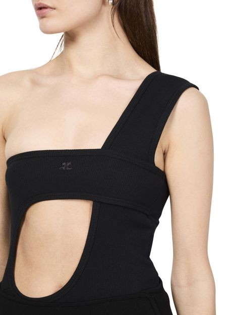 説明 : 刺繍ロゴ, 目に見えるステッチ, レギュラーレングス, ノースリーブ, アシンメトリーネックライン.