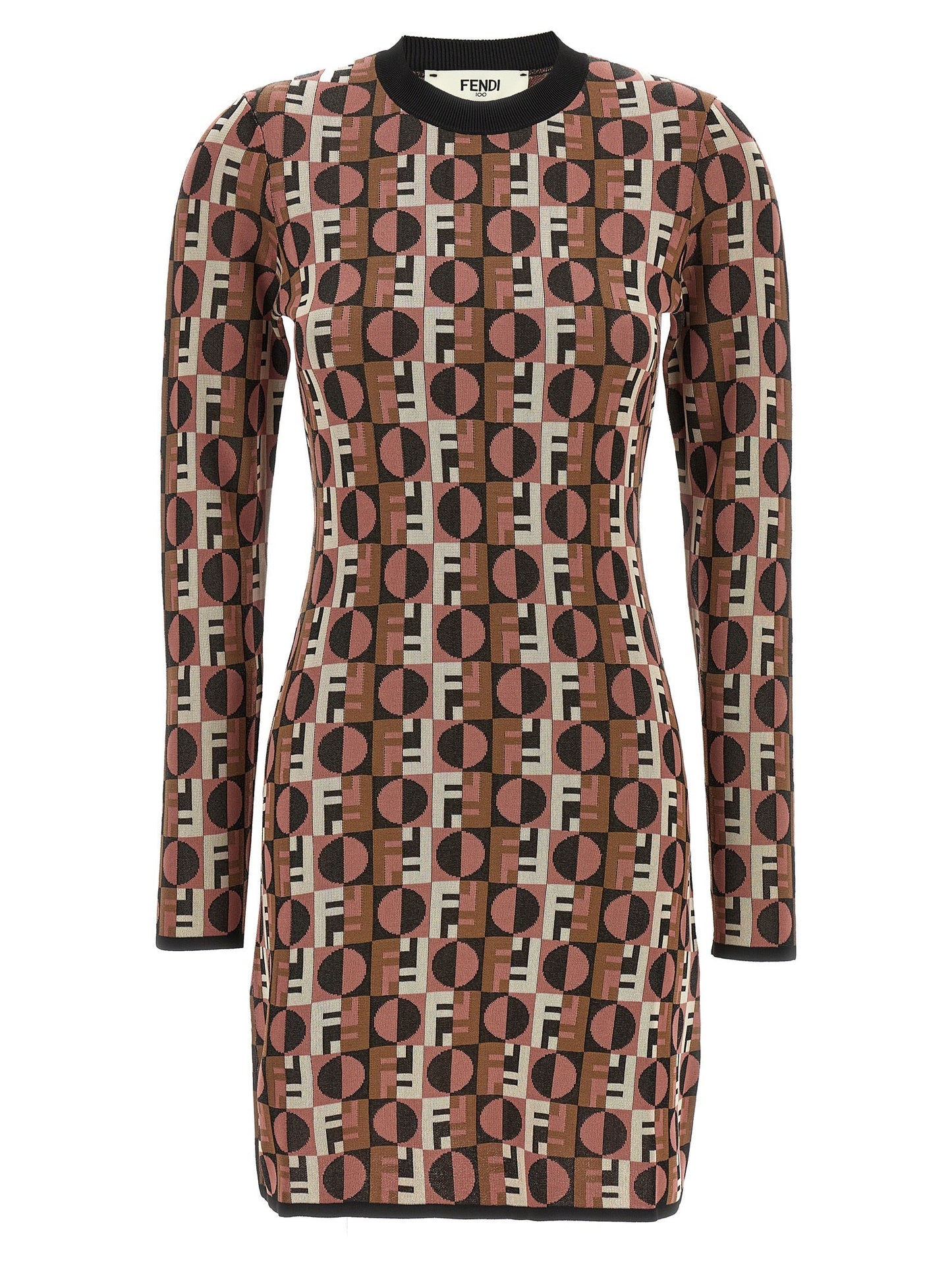 幾何学的なパターン「Fendi optical」3次元効果、乗組員の首、長袖を備えた光沢のあるジャキュードのミニドレス。 フェンディ 「フェンディオプティカル」ドレス スリムフィット