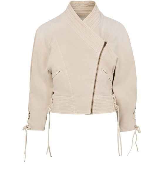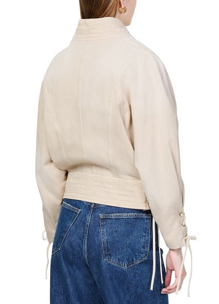 説明 : レースのディテール, ファスナー開閉, ハイネック, カジュアルジャケット, サイドポケット, ロングスリーブ, ルーズフィット, ショート.