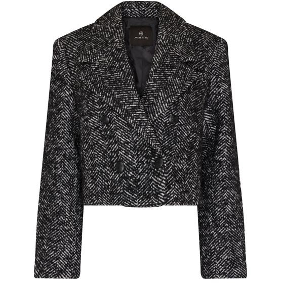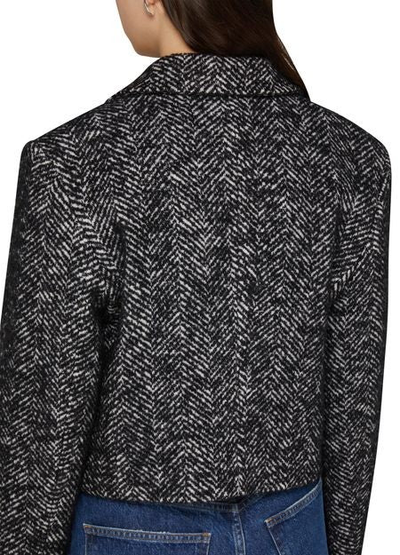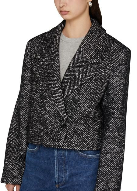 説明 : ダブルブレスト, アップリケロゴ, ノッチドカラー, クロップ, ロングスリーブ.