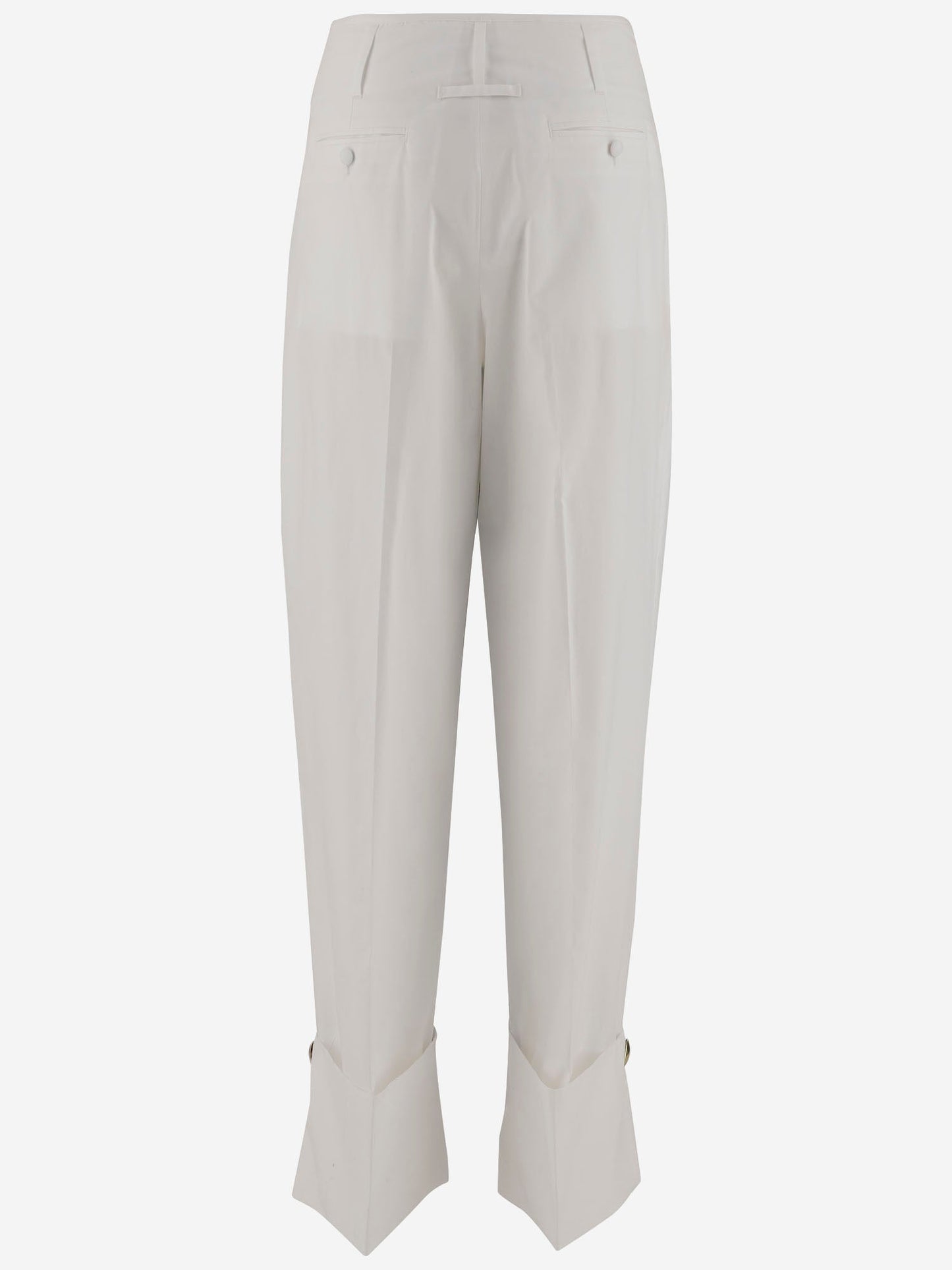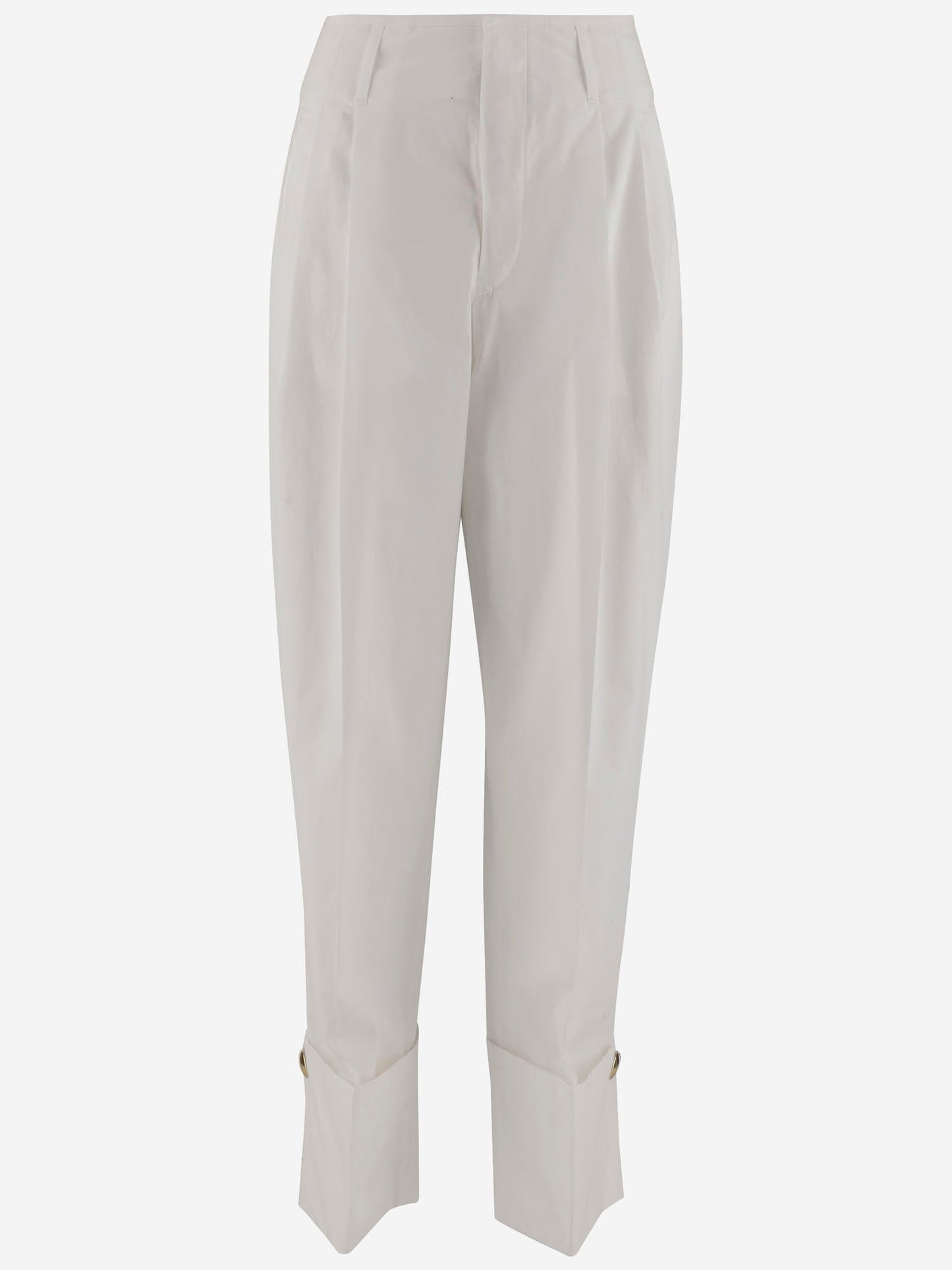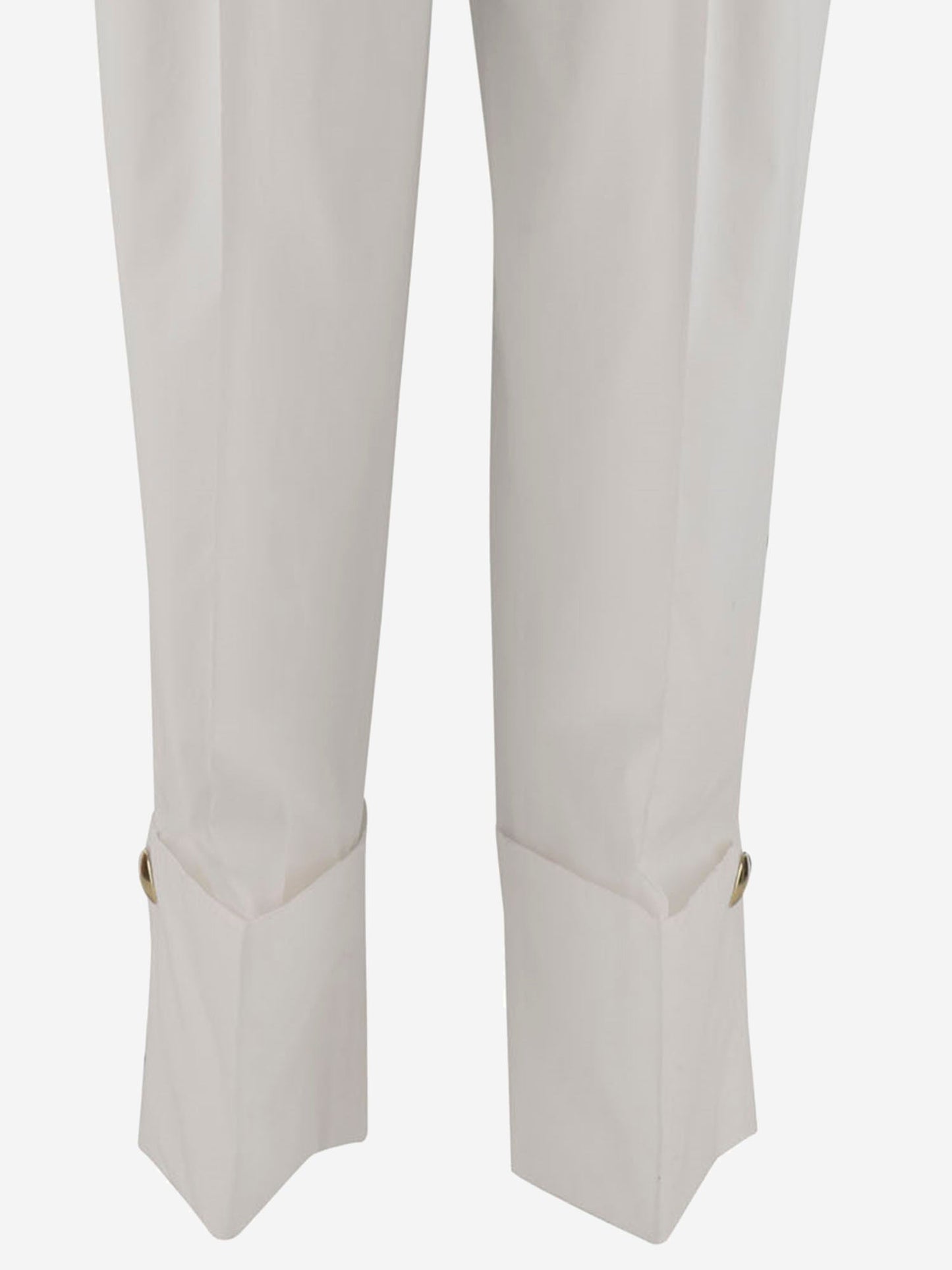 綿から作られたズボン ベルトループ付きウエスト ジッパーとボタンのフロントクロージャー ゴールドボタンの詳細を備えた裾の袖口 まっすぐな脚 白 イタリア製 作曲:100%綿 モデルはサイズ40を着用しています IT. モデル測定: 高さ:175 cm 胸:86.5 cm 腰:65 cm ヒップ:92 cm 肩:40 cm