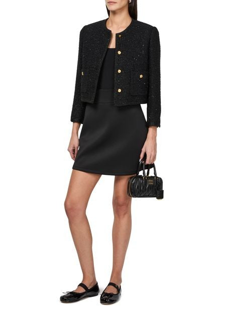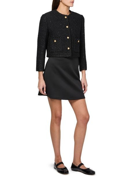 説明 : フロントボタン留め, 装飾ボタン, アップリケロゴ, ショート, パッチポケット, 2フロントポケット, 七分袖, カジュアルジャケット, カラーレス.