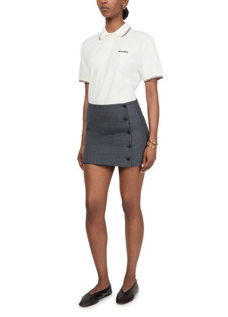 説明 : Embroidered "miu miu" logo, short-sleeved, chest logo, button fastening, visible stitching, polo-shirt collar.
