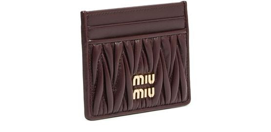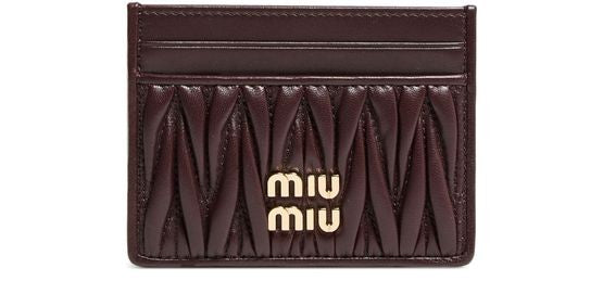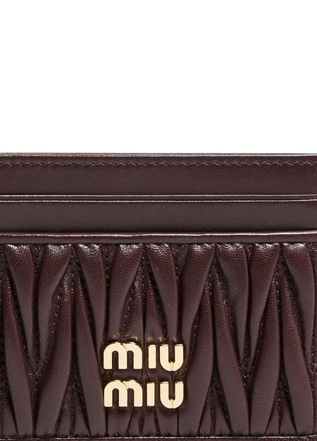 説明 : Card holders, metallic "miu miu" lettering, signature quilted herringbone detail, smooth leather, visible topstitching, front logo, gold finish, padded texture.