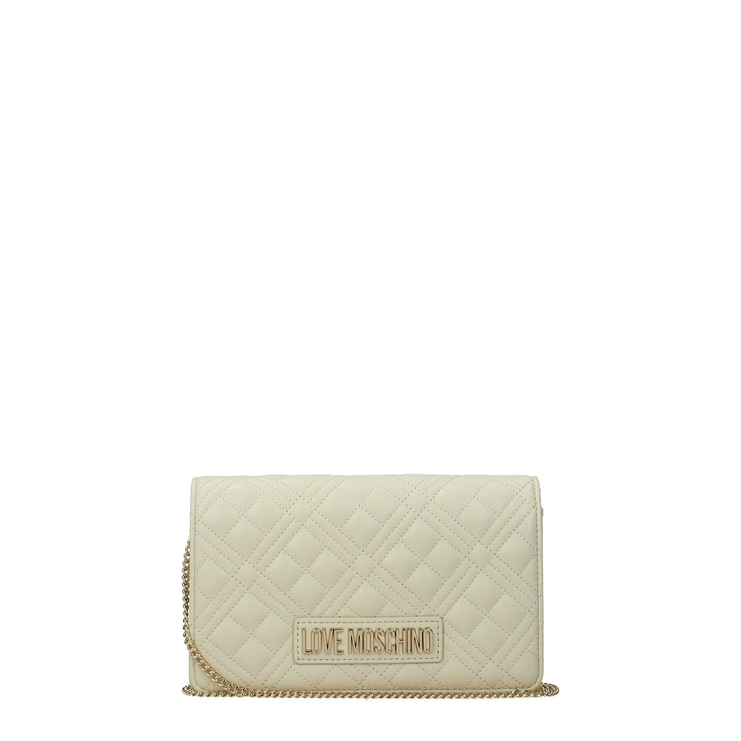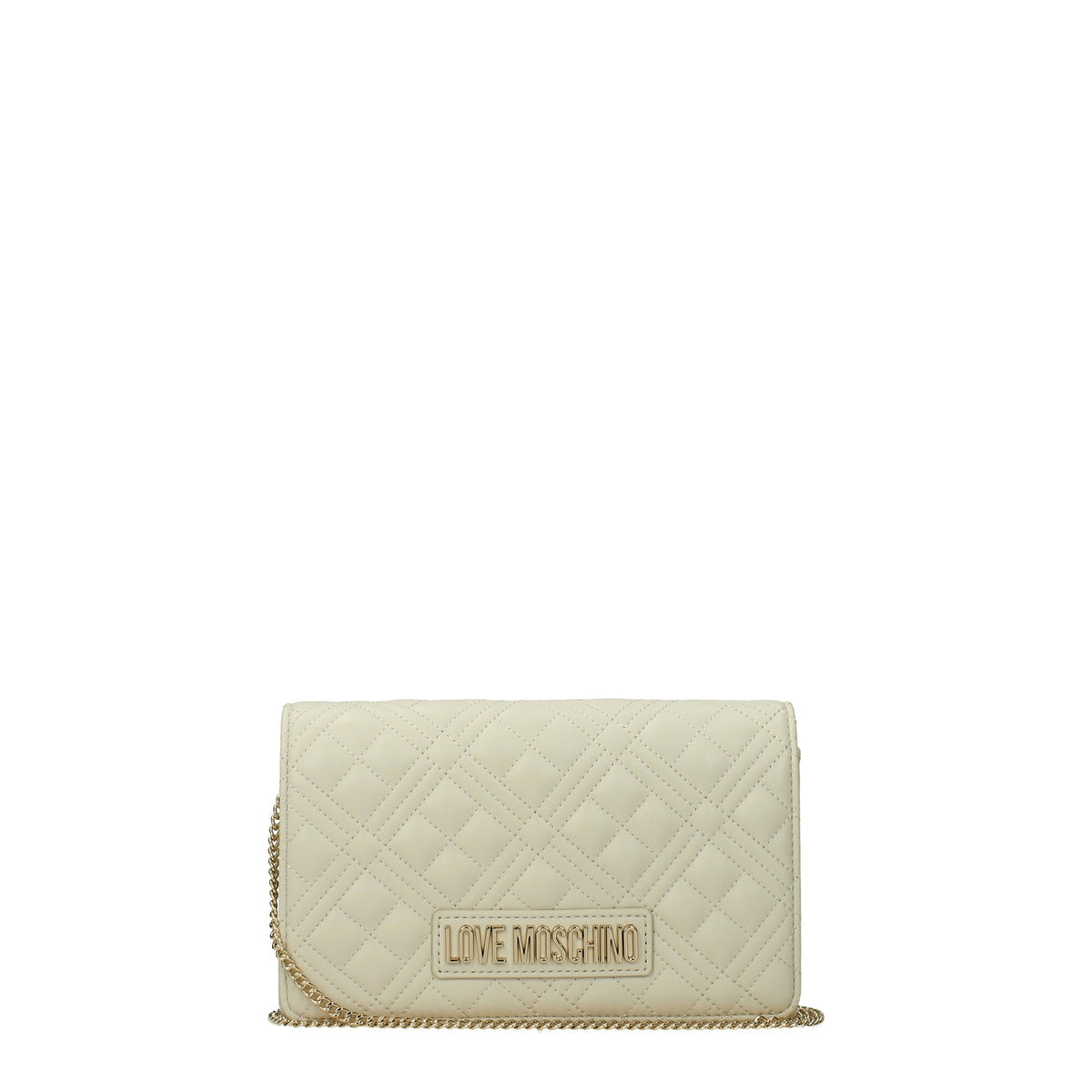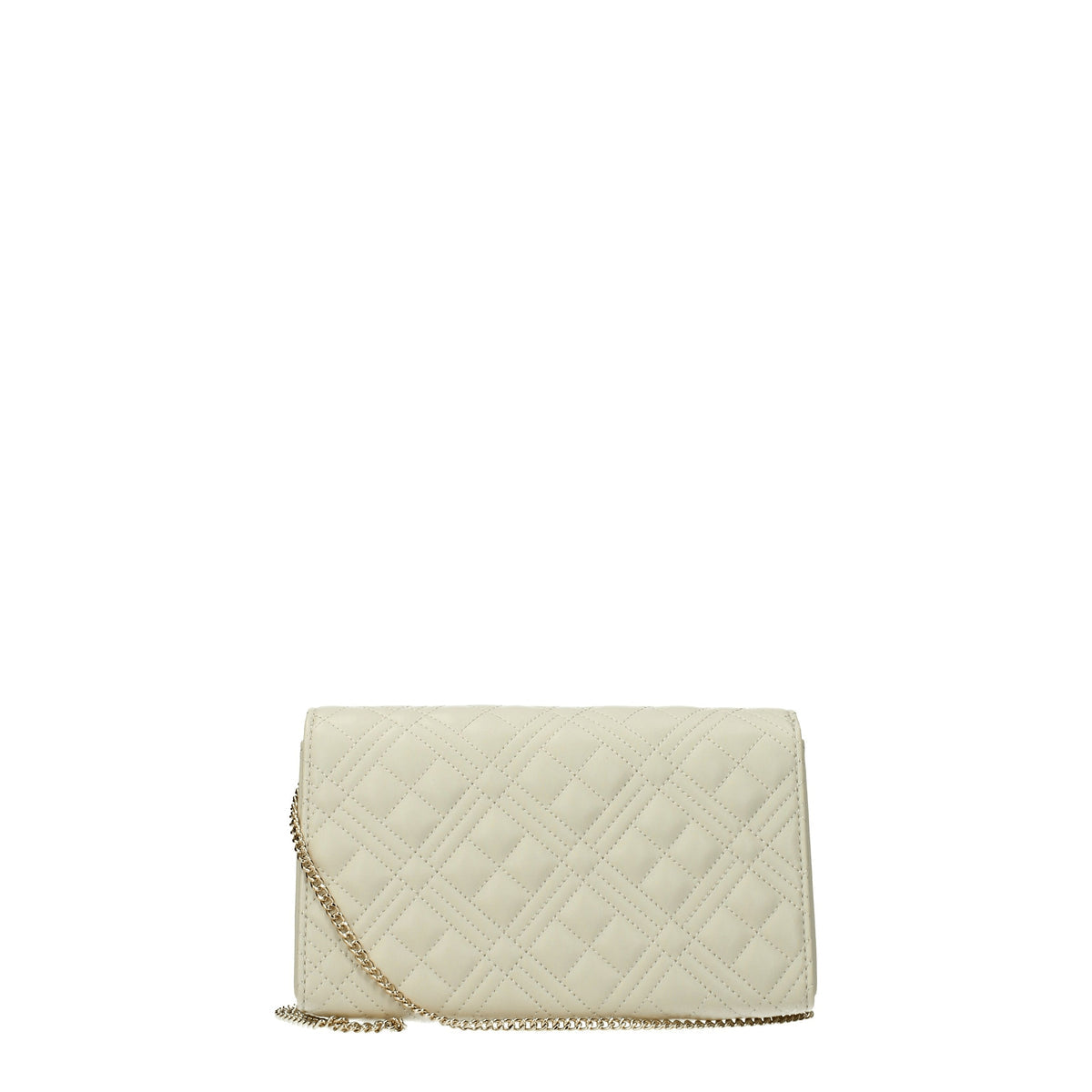 The item with MPN JC4079PPLA0110 and code F65474 in polyurethane of beige color is part of the category clutches of the designer Love Moschino. It has features such as front logo.