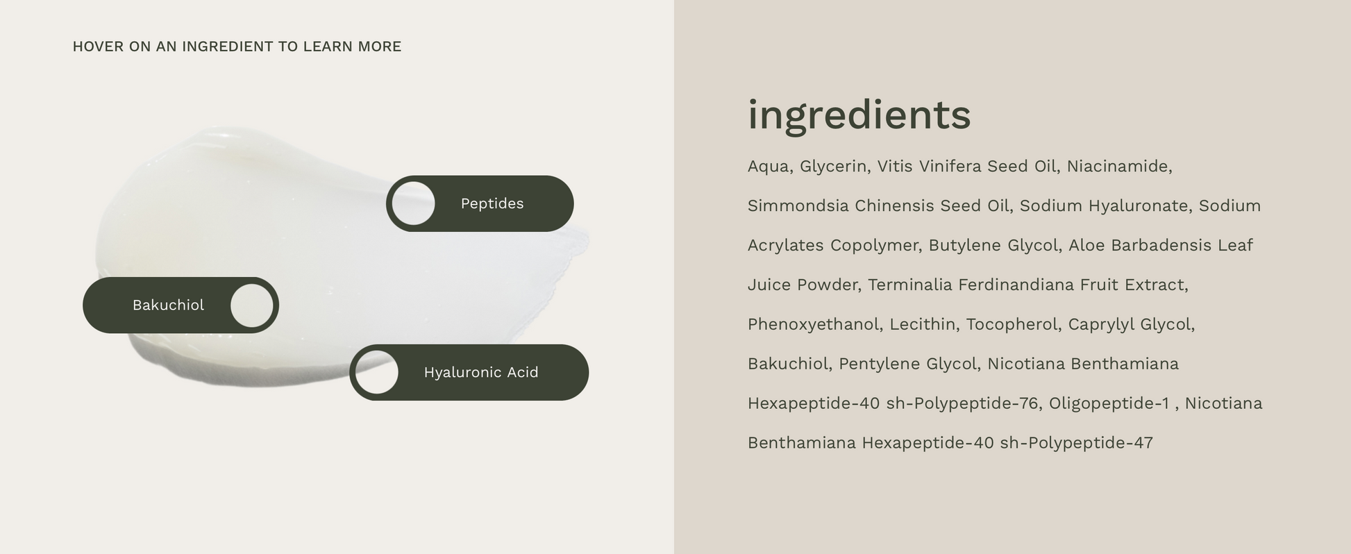 A peptide face cream designed to improve hydration and reduce the appearance of wrinkles. Infused with a potent blend of Vitamin C, plant-based Collagen and Bakuchiol, this lightweight cream leaves skin firmer, plumper and visibly nourished with a naturally radiant glow. To get the most effect results from this product, ensure you use routinely for 30 days. This allows for cell turnover to show visible changes. The second step in your morning routine and third step in your evening BB SKIN ritual.