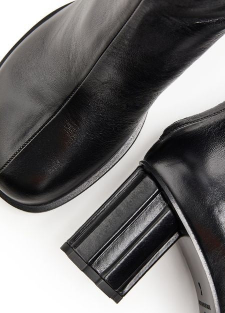 説明 : バックファスナー, 目に見えるステッチ, ブーツ, ミディアムヒール, ブロックヒール, ラウンドトゥ, クローズ.