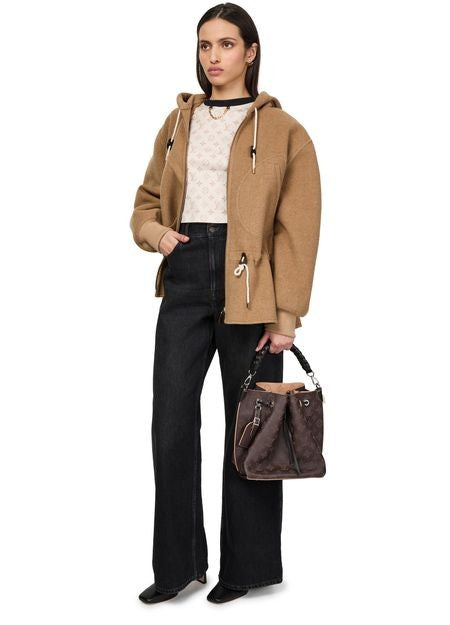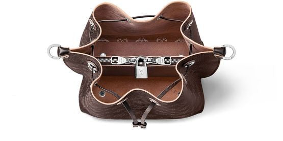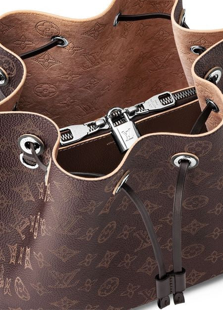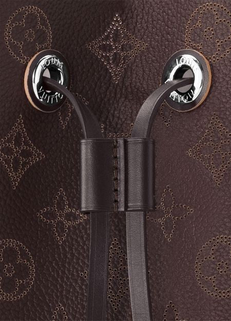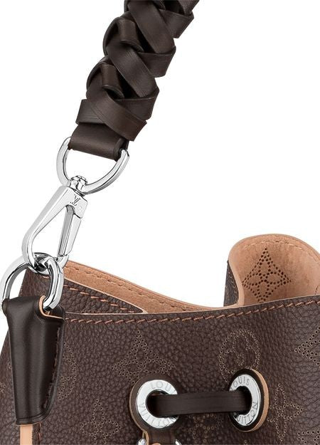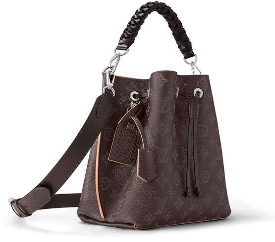 説明 : 小型バケツバッグ, ドローストリング開閉式, プリントロゴ, ブランドモノグラム, 全面ロゴ, シルバーフィニッシュ, 斜め掛け, 手持ち, 取り外し可能なストラップ, 総柄.