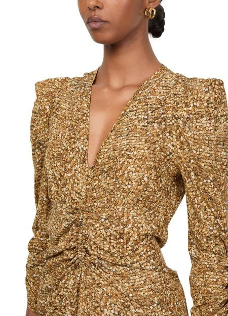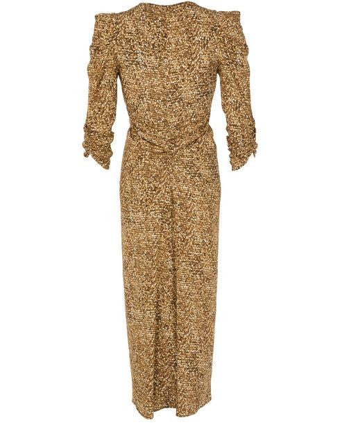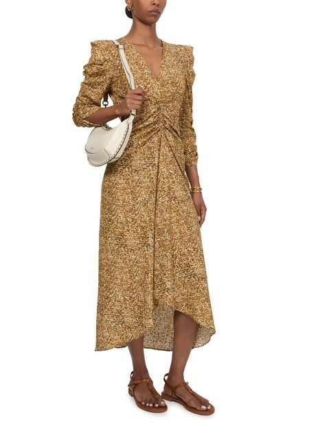 説明 : Slim fit, v-neck, three-quarter-sleeved, midi dress, front slit.