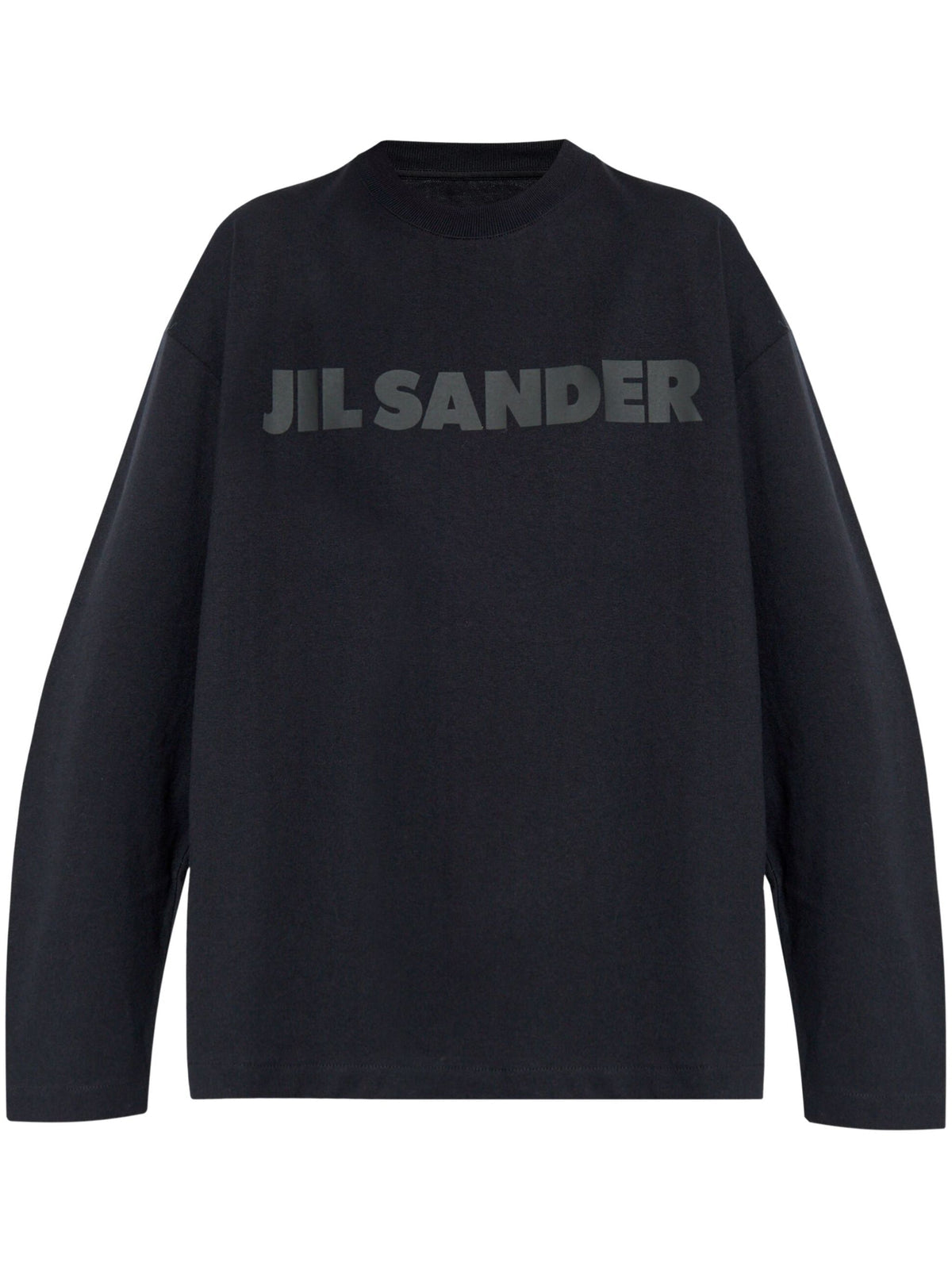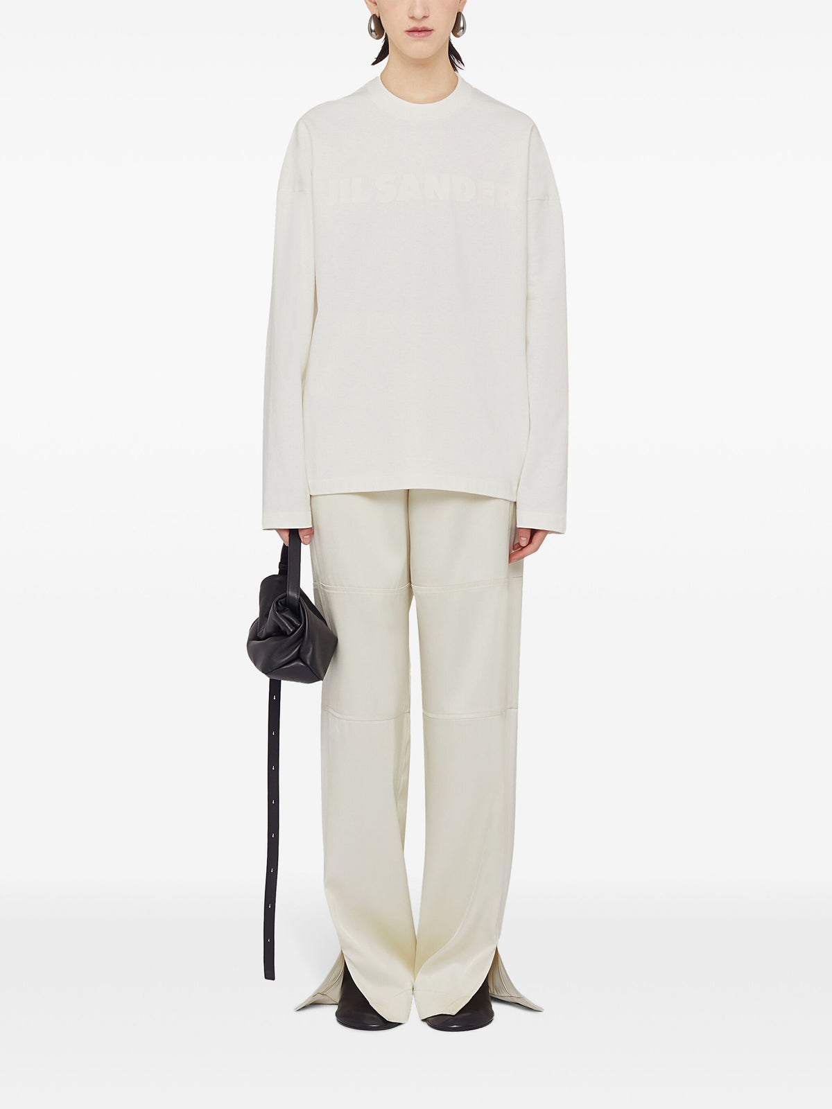 • 軽量のコットンジャージのジルサンダーTシャツ、特大とロングカット。柔らかい肩、長袖、リブ付きクルーネックが特徴で、前面に印刷されたトーンオントーンのロゴで装飾されています。