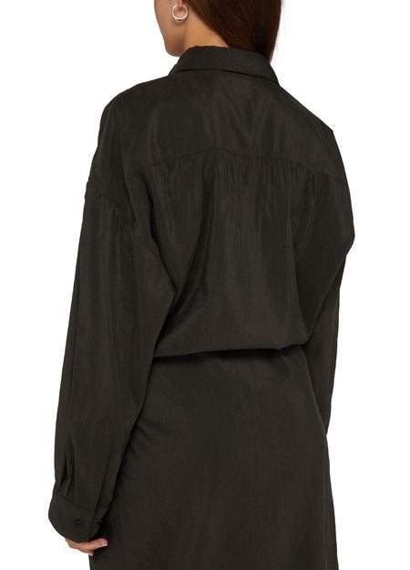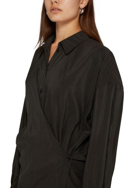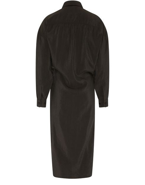 説明 : フロントボタン留め, ドレープディテール, アップリケロゴ, 背面ロゴ, 目に見えるステッチ, シャツカラー, ミディドレス, ロングスリーブ, ボタン付きカフス, カフスボタン付きスリーブ.