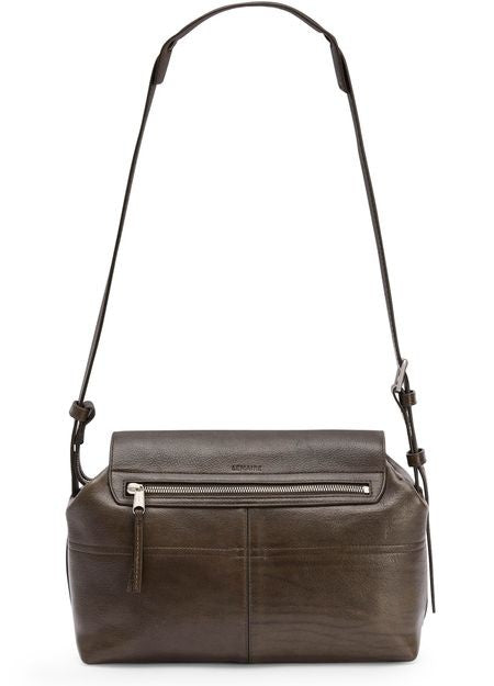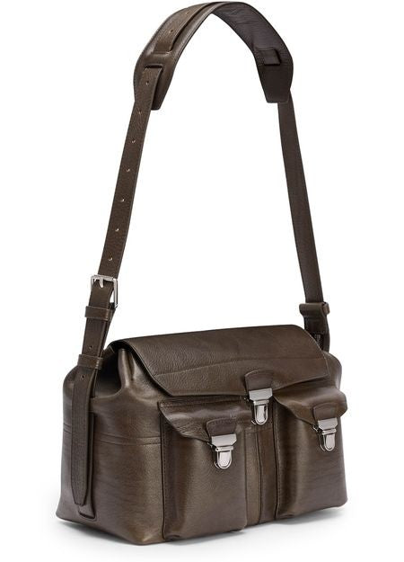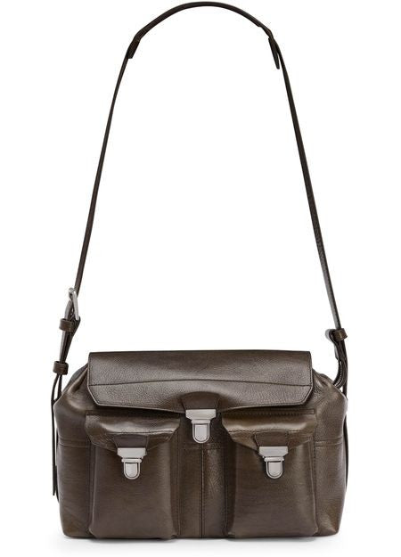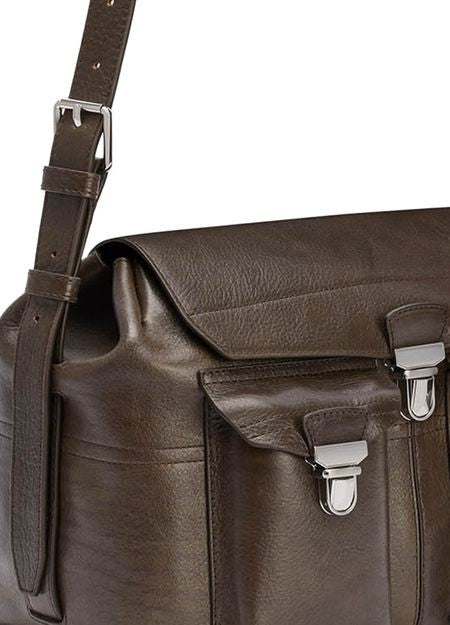 説明 : 肩掛け, バックポケット, フロントポケット, ファスナー開閉, 飾りステッチ, 背面ロゴ, 刻印ロゴ, メッセンジャーバッグ, シルバーフィニッシュ, シングルコンパートメント.