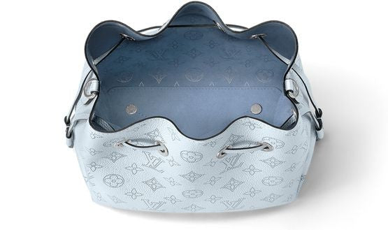 説明 : 小型バケツバッグ, 取り外し可能な内袋, ドローストリング開閉式, プリントロゴ, 全面ロゴ, シルバーフィニッシュ, 斜め掛け, 手持ち, 調節可能なストラップ, 飾りステッチ.