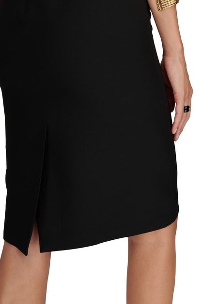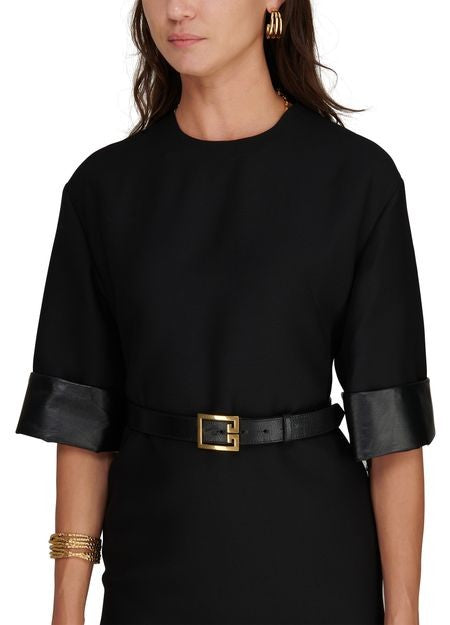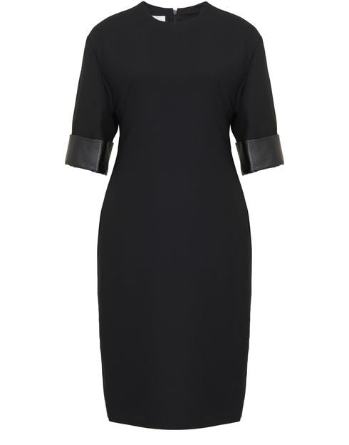 説明 : ミディ丈ドレス, あたたかな素材, テクスチャーのコンビネーション, 七分袖, 折り返し, バックにファスナー開閉, スリムフィット.