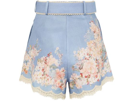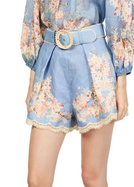 説明 : Floral print, side pockets, pleats on the front, belted waist, button fastening, lace details, scalloped edges, belt loops.
