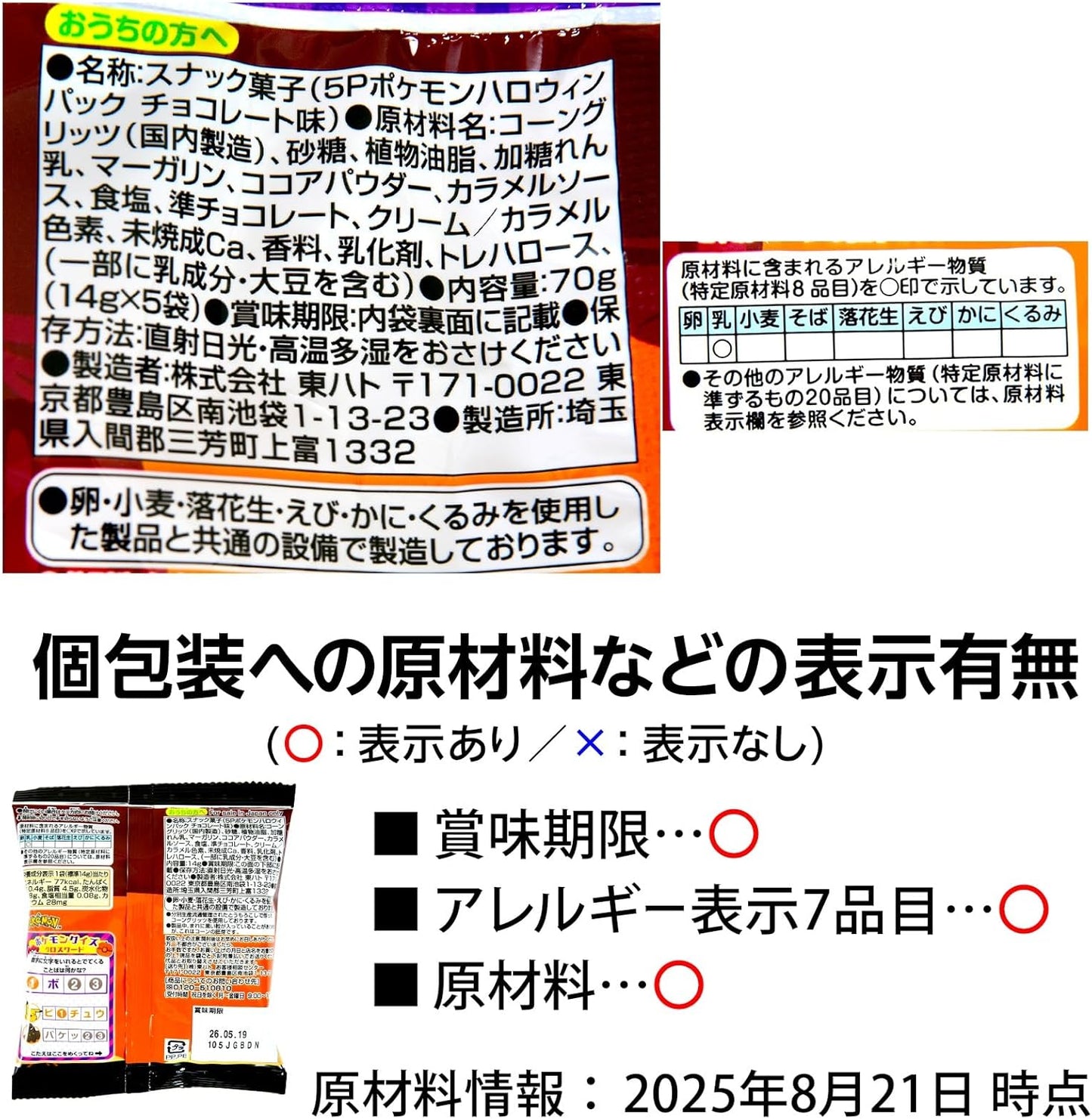 • ✅【セット内容】1袋5個入り×4袋、合計20個セット。配布や小分けに適した内容量です。 • ✅【ピカチュウ型スナック】かわいいピカチュウの形をしたふんわりスナック。チョコレート味で子どもに大人気です。 • ✅【ハロウィン限定パッケージ】全15種類のポケモンデザイン個包装で、開けるたびにワクワク楽しめます。 • ✅【クイズ付きで遊べる】パッケージにはポケモンクイズ付き。食べながら楽しく遊べ、イベントをさらに盛り上げます。 • ✅【イベント利用に最適】学校行事、子ども会、商店街イベント、法人の販促配布など、大人数向けの配布用に便利です。