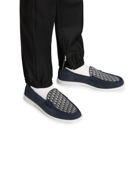 説明 : ネイビーブルーのスエードとベージュ & ブラックの「ディオール オブリーク」ジャカード, ヒールカウンターにDiorシグネチャー, ロートップ, プルオン スタイル, ホワイトのラバーアウトソールに「ディオール オブリーク」モチーフの刻印, ウェルデッド構造, ダストバッグ付き, イタリア製.