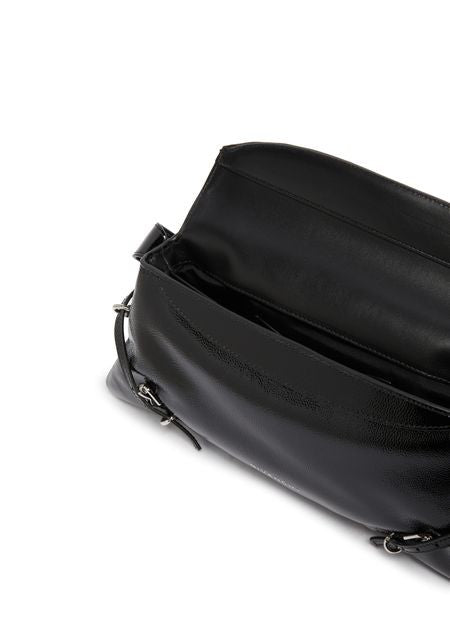 説明 : マグネットクロージャー, フラップ開閉式, シングルハンドル, 前面ロゴ, 銀文字ロゴ, 飾りステッチ, 取り外し可能なストラップ, 肩掛け, ナローストラップ, ミニバッグ.
