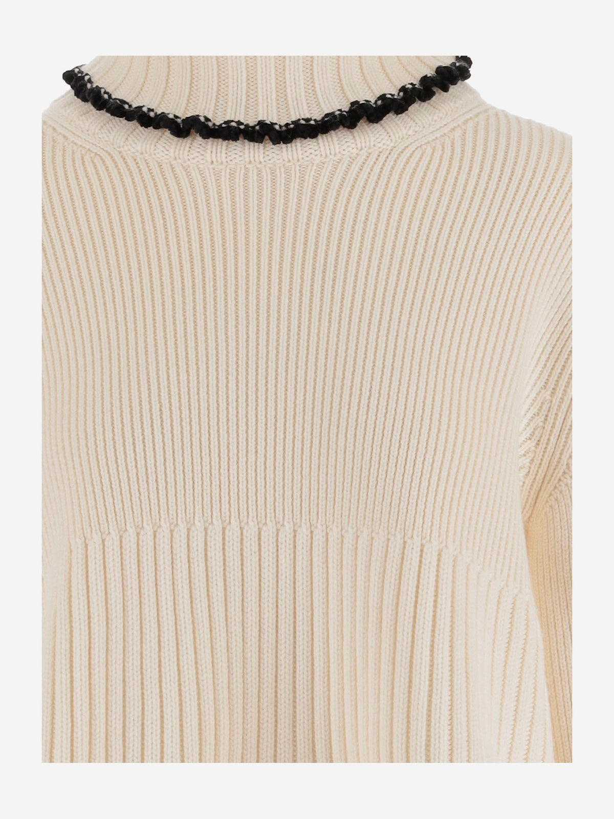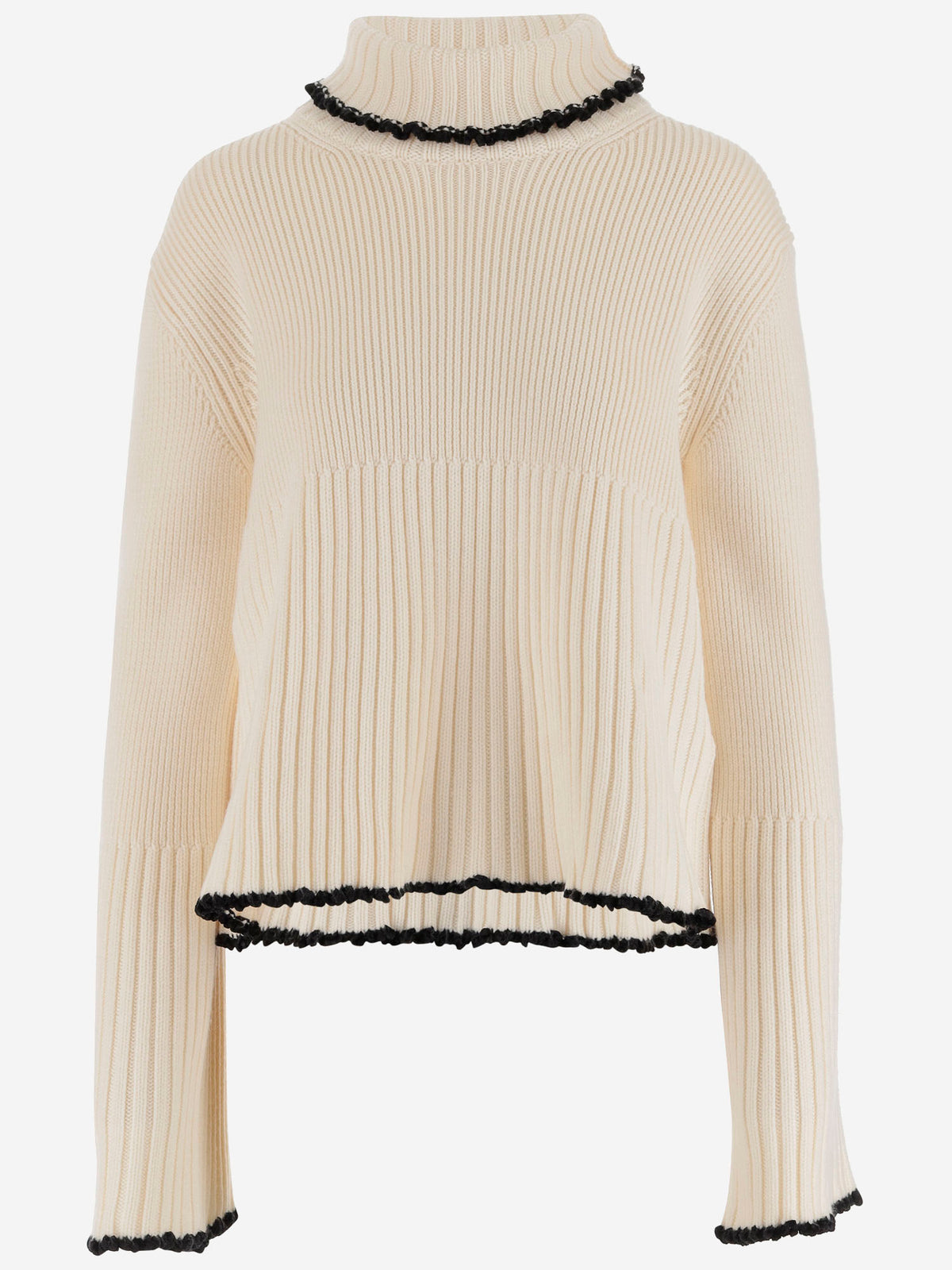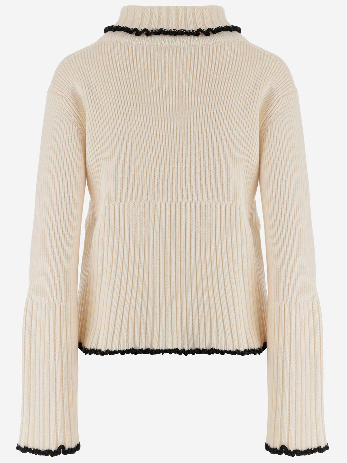 • ウールブレンドセーター • 首の高い • 長袖 • コントラストフリルエッジ • 全面的なリブ付きニット • アイボリー、黒 • イタリア製 • 組成:65%バージンウール20%ビスコース15%ポリアミド • モデルはサイズ40を着用しています IT. • モデル測定: • 高さ:175 Cm • 胸:86.5 Cm • 腰:65 Cm • ヒップ:92 Cm • 肩:40 Cm