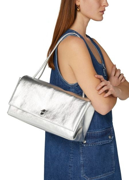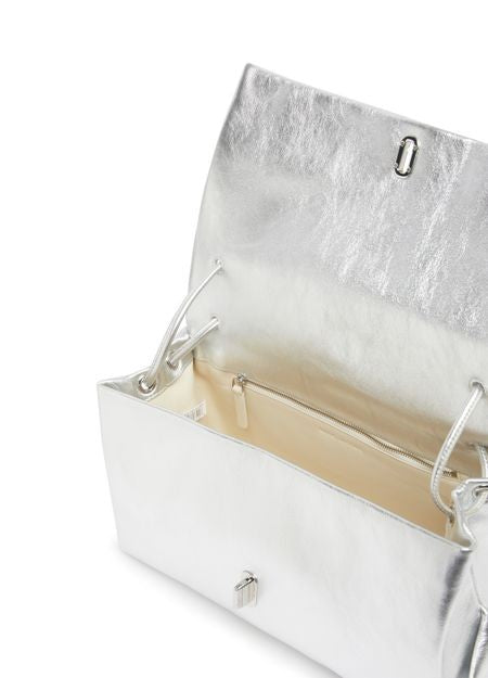 説明 : ツイストロック, フラップ開閉式, シングルコンパートメント, シルバーフィニッシュ, シングルハンドル, ファスナー付き内ポケット, 飾りステッチ, 肩掛け, ナローストラップ, ミニバッグ.