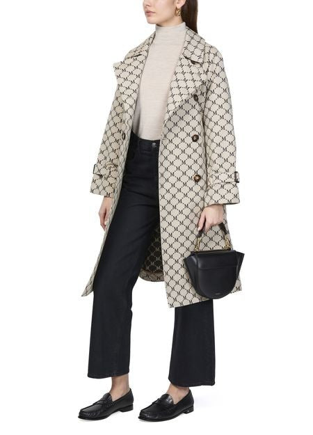 説明 : ダブルブレスト, プリントロゴ, 全面ロゴ, 膝丈, ロングスリーブ, カラー, トレンチコート.