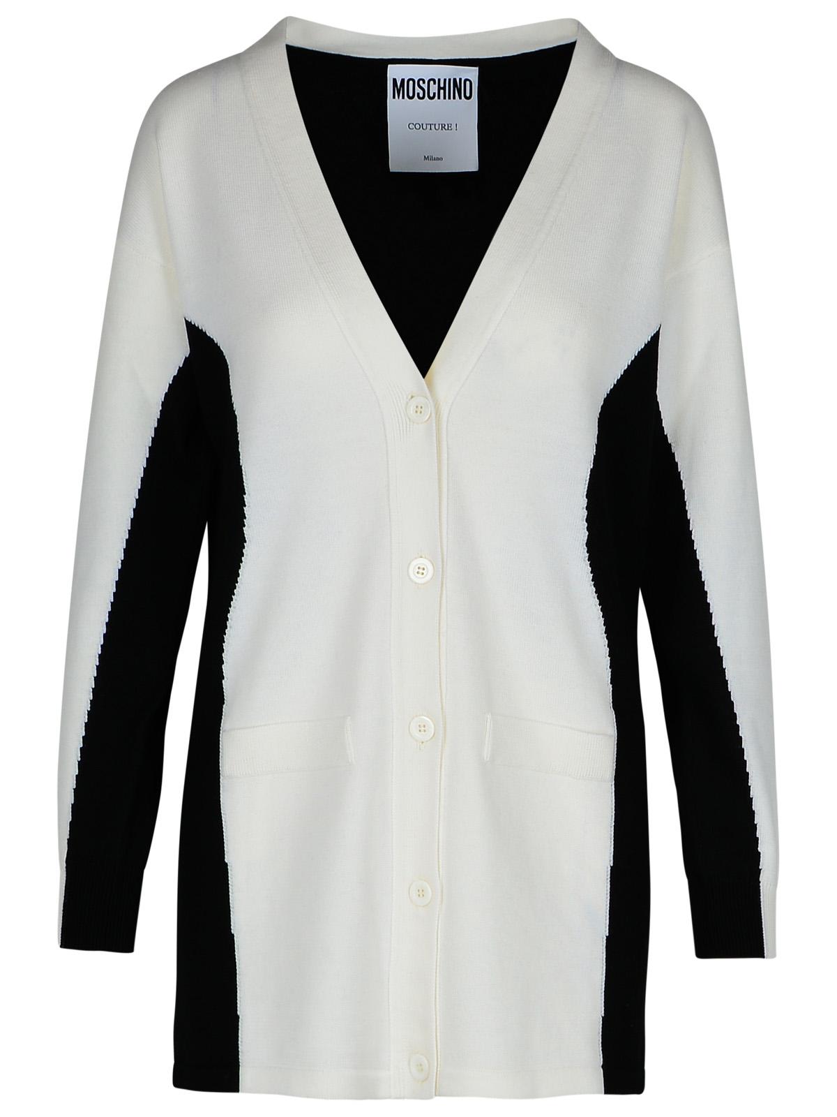 • 'V'ネックライン、トーンオントーンボタンを備えた中央閉鎖、コントラストサイドトリム、2つのフロントポケット、リブ付きカフス • モスキーノ • ホワイトバージンウールカーディガン