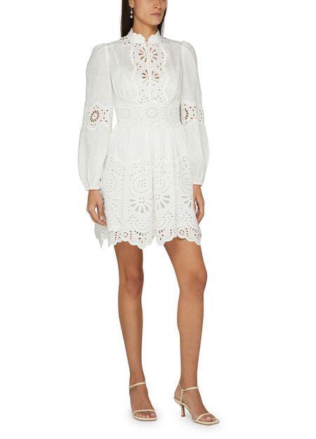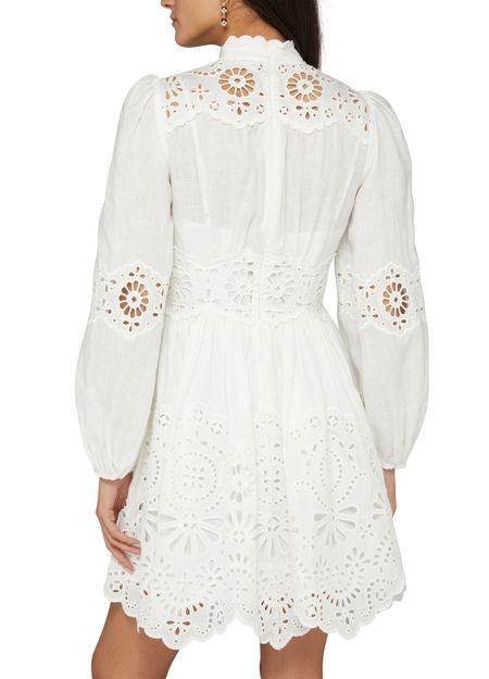 説明 : レースのディテール, 目に見えるステッチ, コンシールバックファスナー, ミニドレス, ハイネック, ロングスリーブ, フレアドレス, カフス, パフ, フィットウエスト.