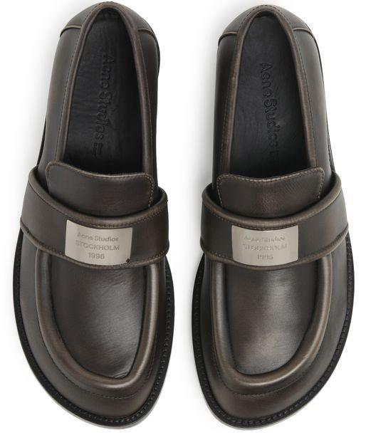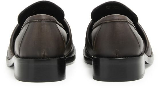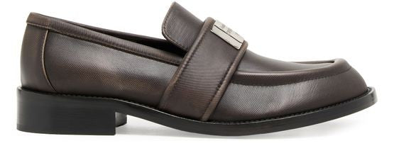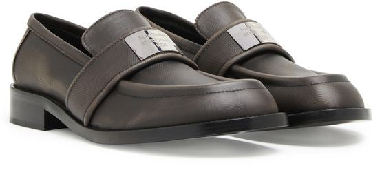 Descrizione: Modello senza lacci, logo inciso, logo frontale, cuciture a vista, mocassino, tacco basso, tacco a blocco, punta tonda, chiuso.