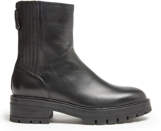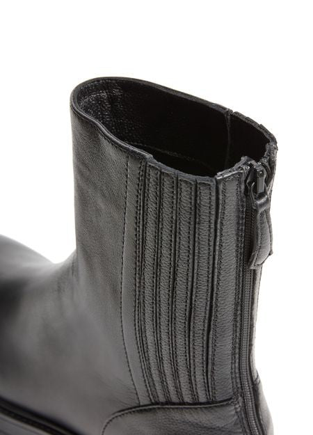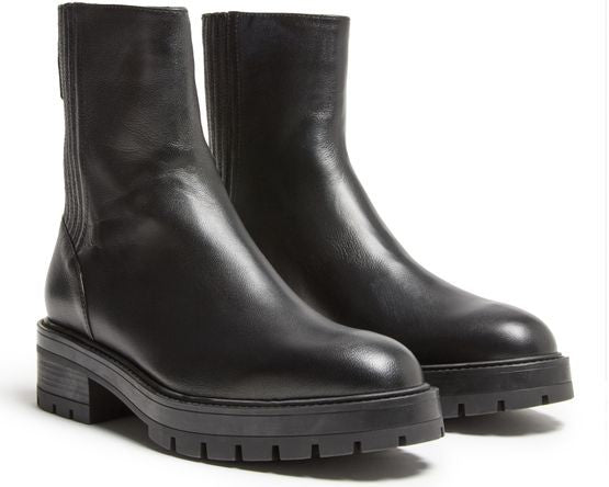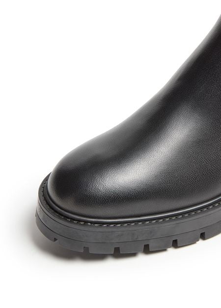 Descrizione: Tomaia alta, suola dentellata, punta quadrata, pannelli laterali elastici, design slip-on.
